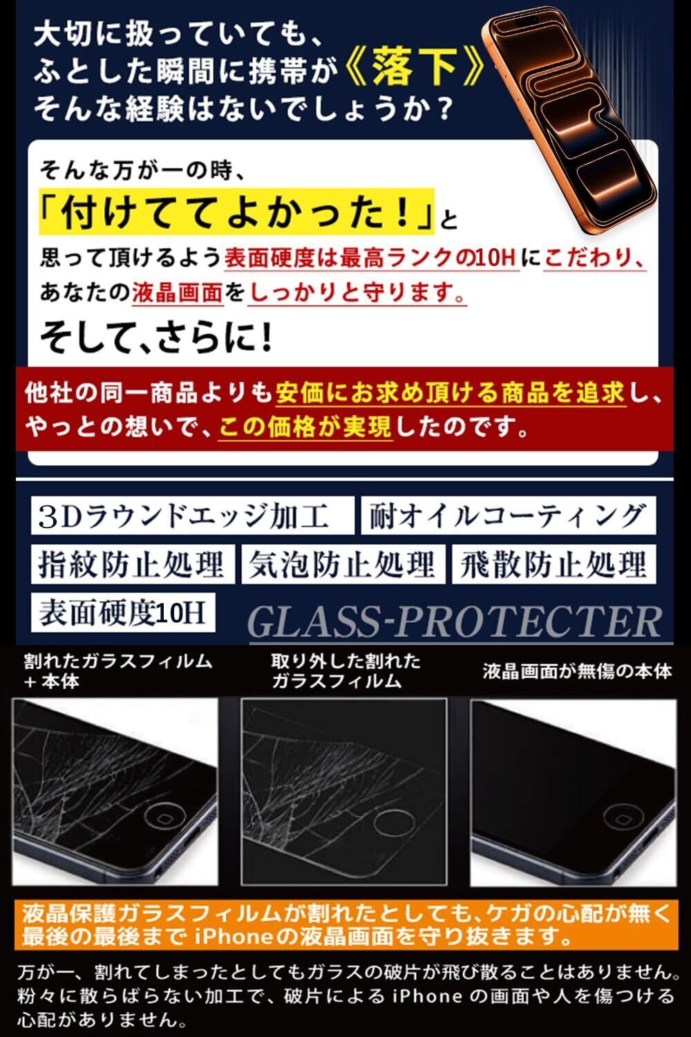 【旭硝子素材・最強硬度10H・飛散防止】ガラスフィルム一般的な液晶保護フィルムの約6倍の強度。衝撃は強化ガラスに吸収されますので、ディスプレイにかかる衝撃負荷を軽減し。ディスプレイが破損することを防ぎます。万が一の破損時も飛散防止加工によって破片はフィルムに張り付いた状態で破片がほとんど飛び散らない安全性の高いガラスになっています。