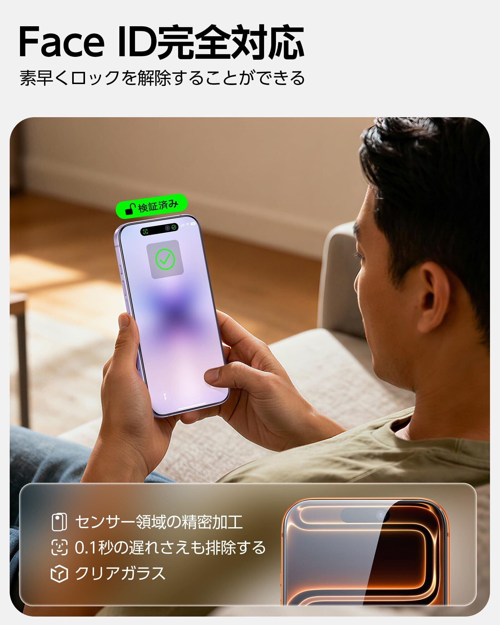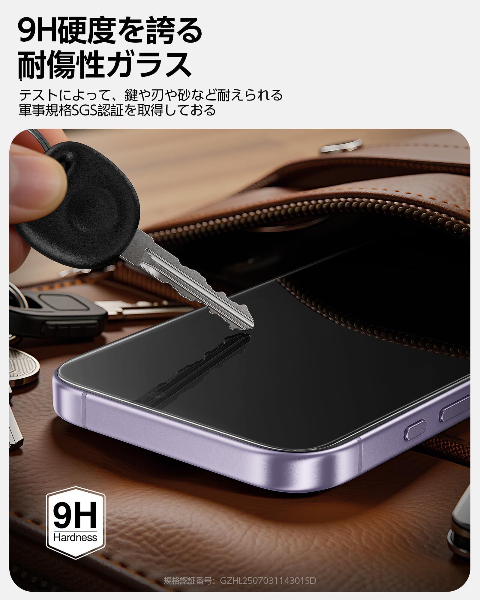 特徴 28°覗き見防止、プライバシーを守り、ガイドボックス付き、自動除塵、貼り付け簡単、強化ガラス、20kg耐衝撃、落下保護、縁なし
