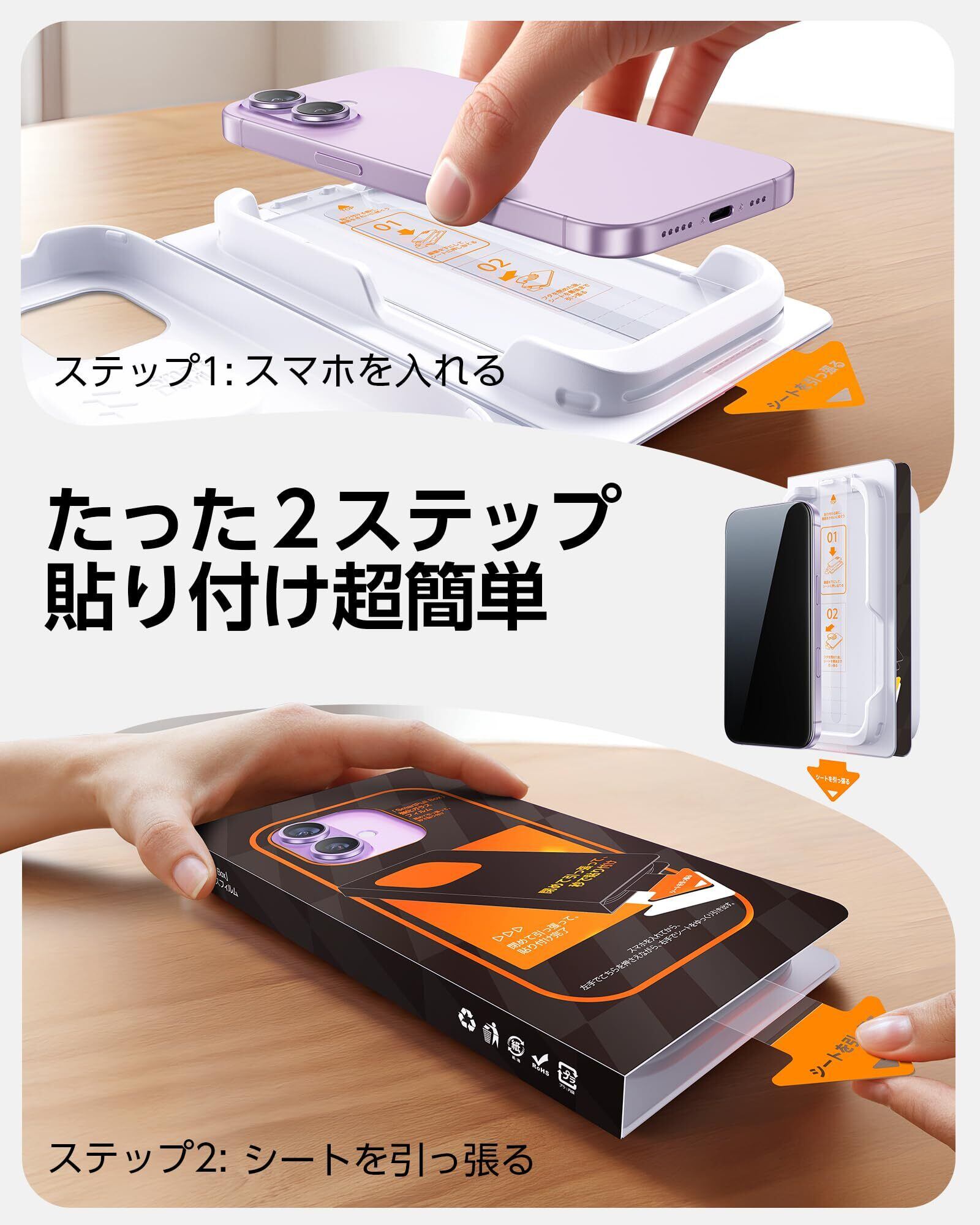 【最新なデザインのガイドボックス】2ステップだけで簡単に貼り付け!ガイドボックスにスマホを入れて、蓋を閉めて、ホコリ除去シートを引っ張ると貼り付け完了です!