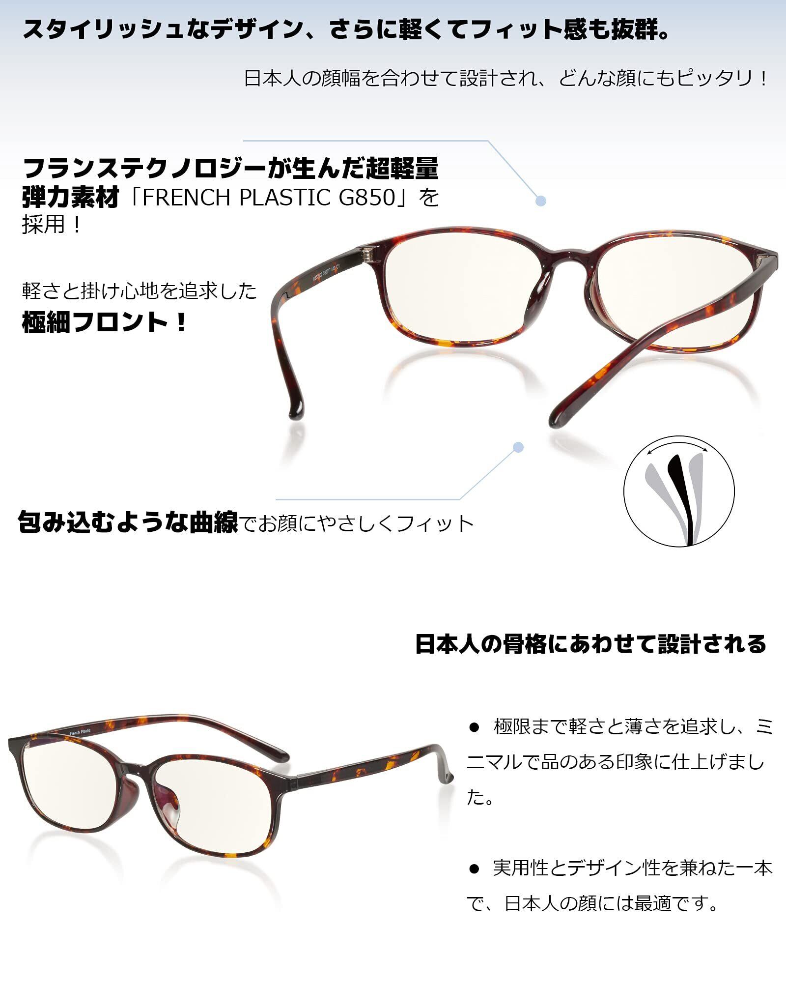 【最新改良版!】ご要望にお応えして ブルーライトカット率45%以上の高機能レンズを新たに搭載!【素材構成】 フレーム素材:超軽量弾力「FRENCH PLASTIC G850」 鼻パッドの形状:フレーム一体型 レンズ:高品質プラスチック/ブルライトカット率45%/UVカット率99%/HEVカット率99%