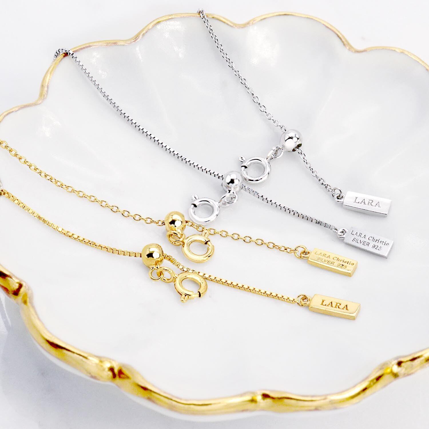 LARA Christieから、もっと自由にコーディネートを楽しんで頂きたい気持ちを込めて、アジャスターチェーンをご用意致しました。人気素材シルバー925にロジウムコーテング・イエローゴールドコーティングを施したジュエリーと同じ仕様。アズキチェーンが輝きます。スライド式を採用し、長さ調節が着用中でも自由自在。簡単に変更が可能で、最長7cmまで無段階で調節が可能です。服装に合わせて長さを変更することで、同じネックレスも全く違う表情を見せます。夏はデコルテに、冬はニットの上から胸元に。コーディネートの幅が広がります。アジャスターの先端にLARA Christieのロゴを刻印した、ロゴプレートをあしらいました。1つ持っているだけでおしゃれの幅が広がること間違いなしのアイテムです。