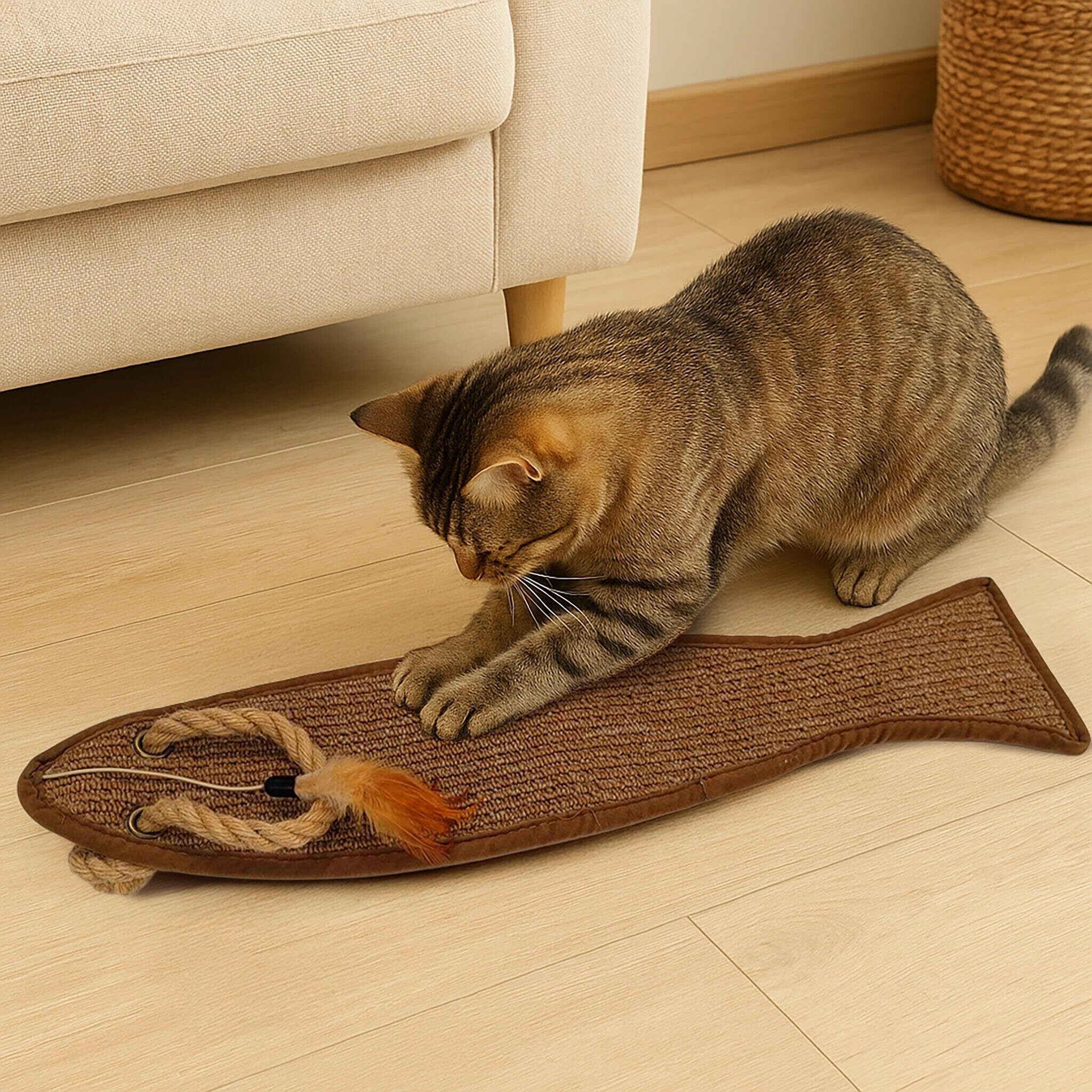 【かわいい魚型デザイン】 ユニークな魚の形をした猫用爪とぎです。お部屋に置いてもインテリアになじむデザインで、見た目にも楽しいアイテムです。 【爪とぎ+おもちゃで遊び心を刺激】 上部には丈夫なロープと羽根のおもちゃ付き。爪とぎだけでなく、遊びながら運動不足やストレス解消にもつながります。 【家具や壁の傷防止に】 猫が家具や壁で爪を研ぐのを防ぐアイテムとしても最適。お気に入りの場所に設置して猫の注意を引きつけましょう。