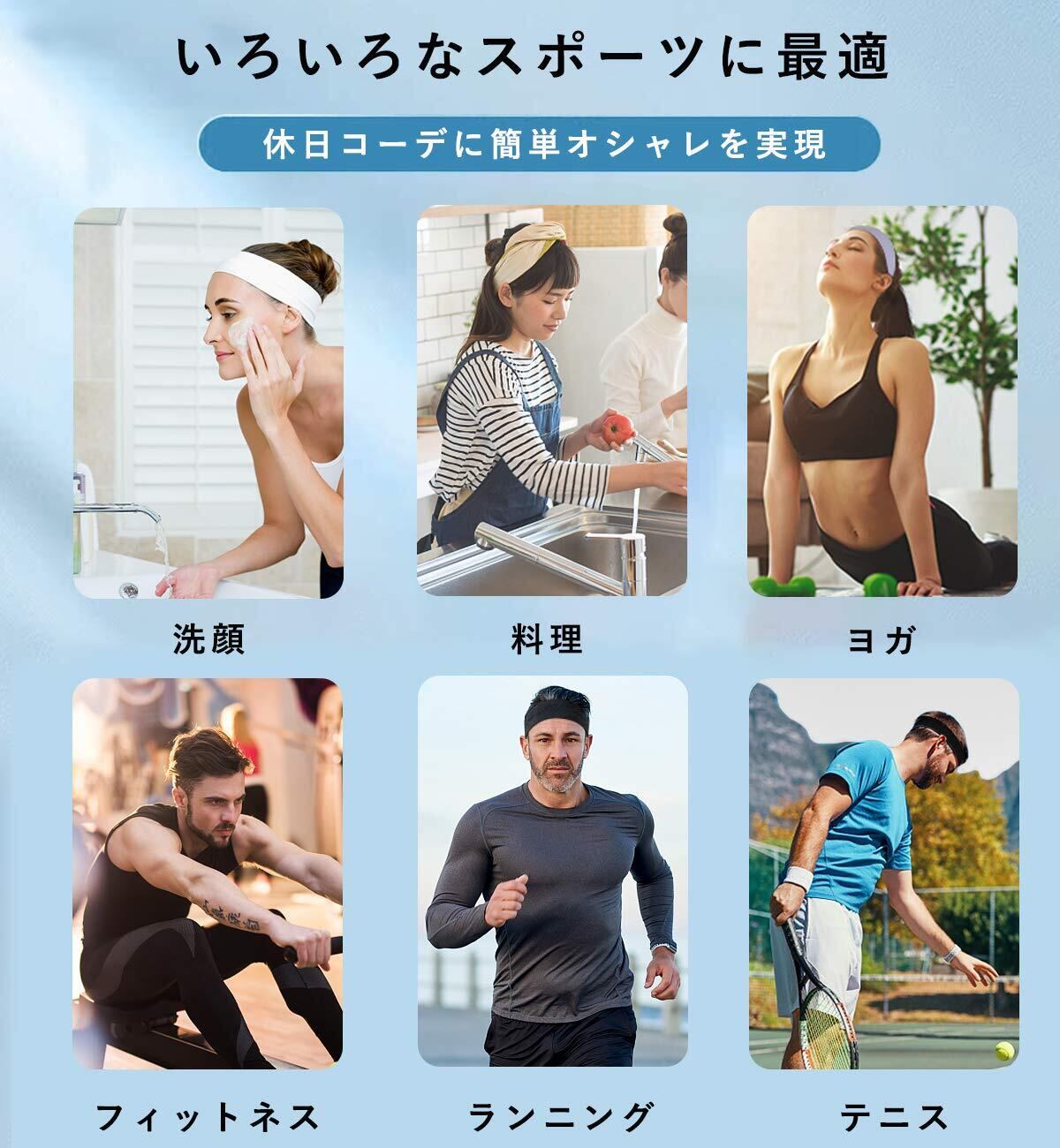 【通気性*伸縮性】通気性の優れた素材を使用している為、様々なスポーツでお気軽にご使用いただけます。適度な伸縮性なので、ダンスやランニングなど激しい運動でもズレたりせず、ピッタリとフィット!スポーツシーンはもちろんですが、お部屋でのリラックスタイムや、お風呂上がりなどでもご使用いただけます。
