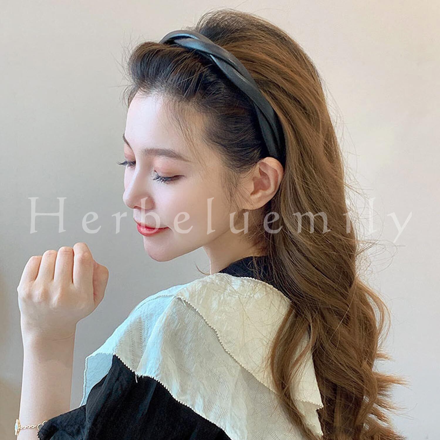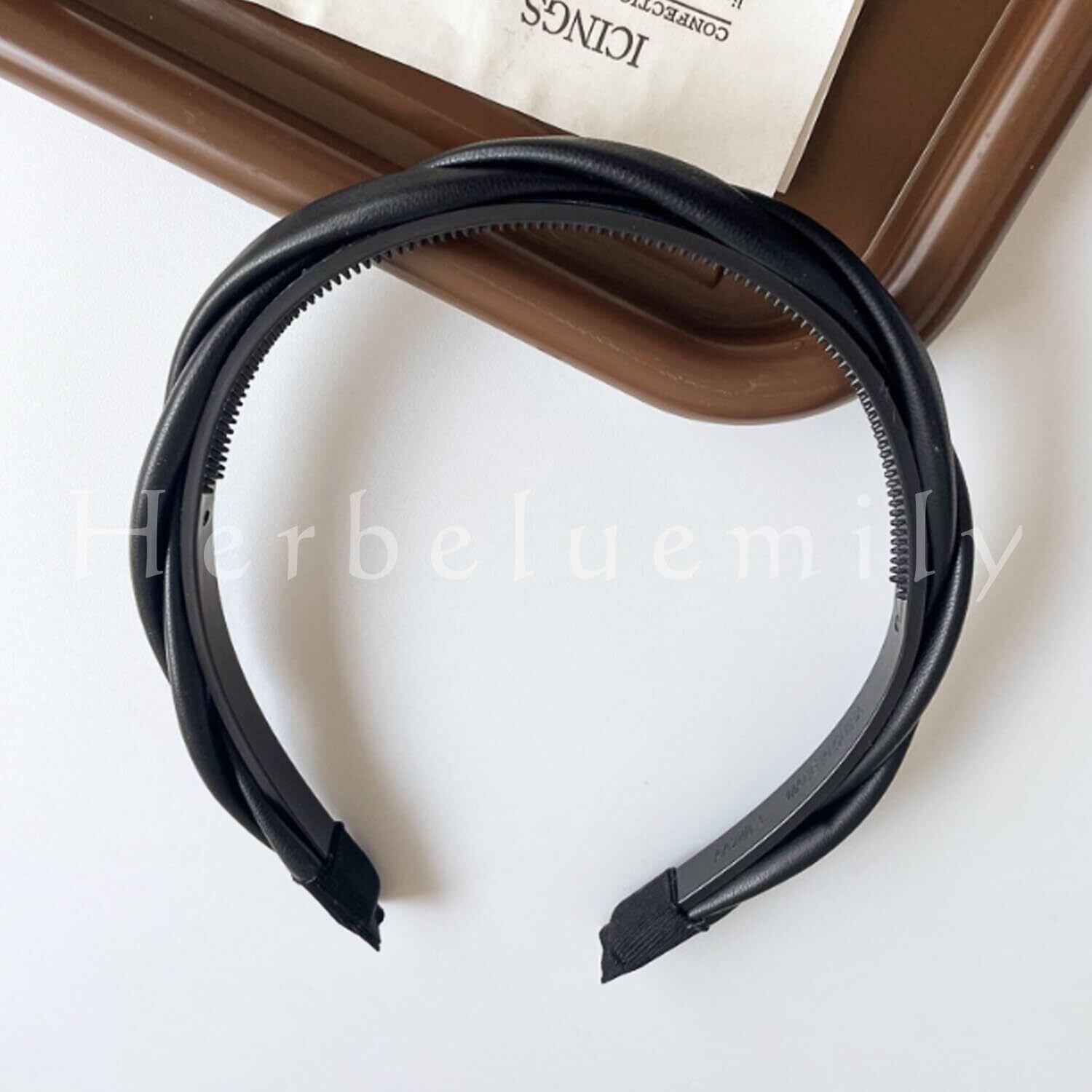 [Herbeluemily] カチューシャ フェイクレザー ヘアバンド クロス ねじり ツイスト 編み込み風 ロープ風 ブラック HM-0069-R02-BK