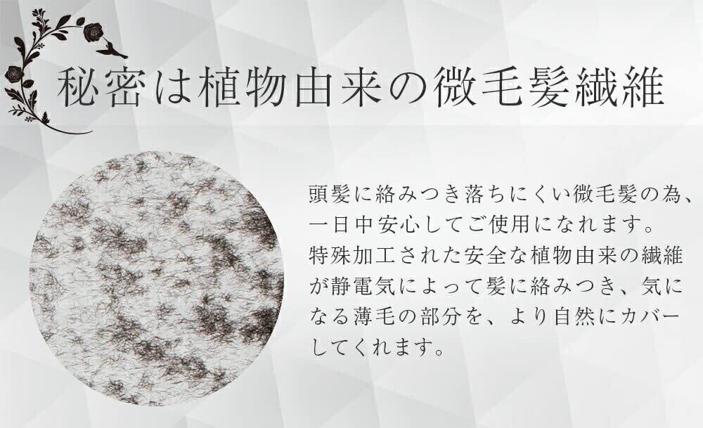 商品名「黒王/BLACK KING」。安心の日本製です。植物由来の繊維で髪の薄くなった部分をカバーします。静電気により髪や産毛に吸着しますが、より安定させるためにヘアミスト(ハード、スーパーハード推奨です。)をご利用ください。男性女性問わずお使いいただくことができます。