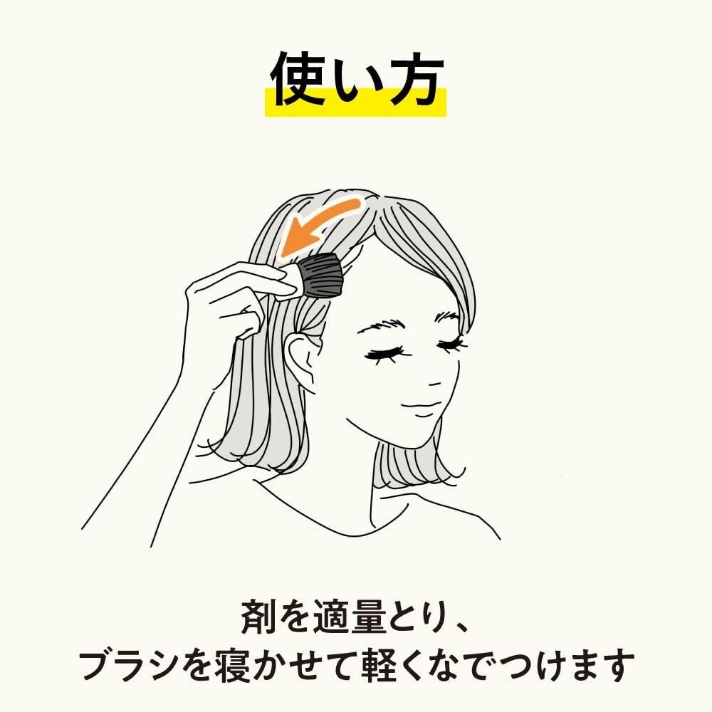 使い方 ①ブラシに剤を適量とります。 ②気になる生え際や分け目の毛流れに沿ってブラシを軽くなでつけ、毛の足りない部分に描き足します。 ●初めてご使用する際は数回ブラシに剤をとって試し描きしてください。 ●落とす時は普段お使いの洗浄料で、よく洗ってください。 ●ブラシをご使用後はティッシュペーパー等でやさしく汚れを拭き取ってください。 ●ブラシの汚れがひどくなりましたら、中性洗剤を薄めたぬるま湯の中で軽く振り洗いをし、よくすすいだ後、水気を取り毛先を整えて十分に陰干ししてください。 ●使用後はフタをきちんとしめてください。 ●白髪染めではありません。