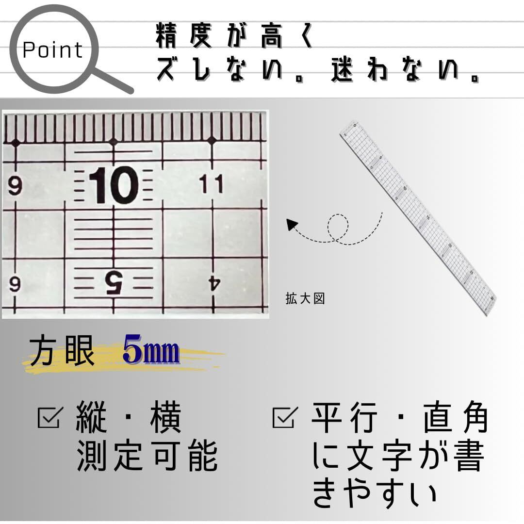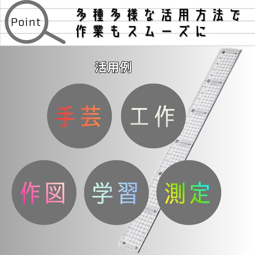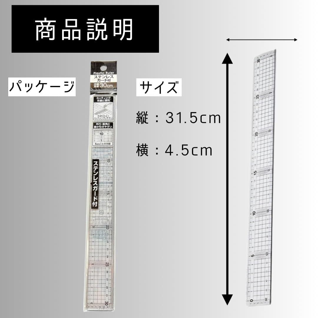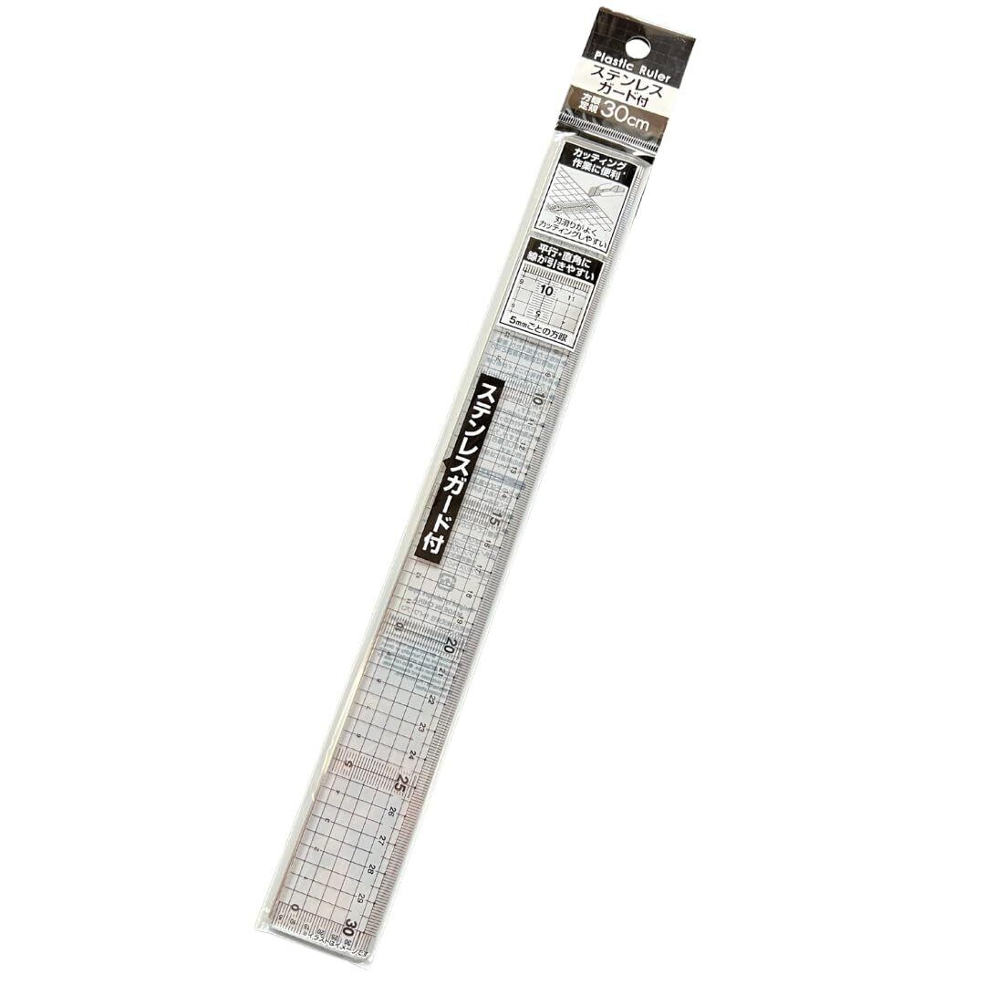 毎日の作業や学習に。安定して使いやすい定規です。 30cmサイズで、日常のさまざまな場面にちょうど良い定規です。透明な本体に1mmごとの方眼入りで、測定やライン引きがスムーズにできます。 さらに、一辺にステンレス加工を施すことで、作業時のガイドとして安定感が増しています。 クラフト作業や学校での使用、製図や手芸など幅広く活躍します。