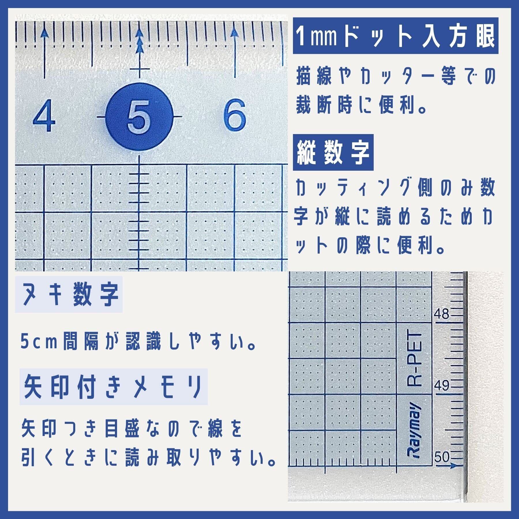 カッティ ング時に便利な縦数字表示。ペッ トボトルの再生樹脂を80%使用した 環境配慮商品。