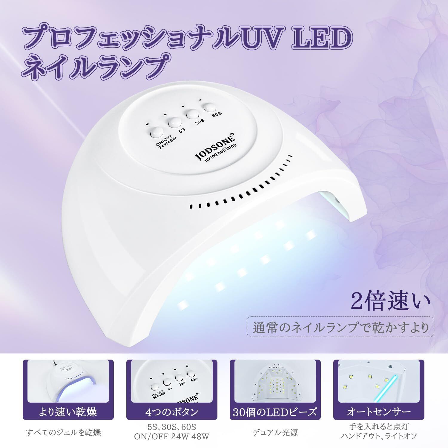 ネイルランプ:この製品には、5秒、30秒、60秒の3つの硬化モードがあり、通常、ジェルの硬化時間は60秒〜120秒で、ジェルがより固くなり、長持ちします。ネイルランプには底がないので、足の指のネイルアートに便利です。
