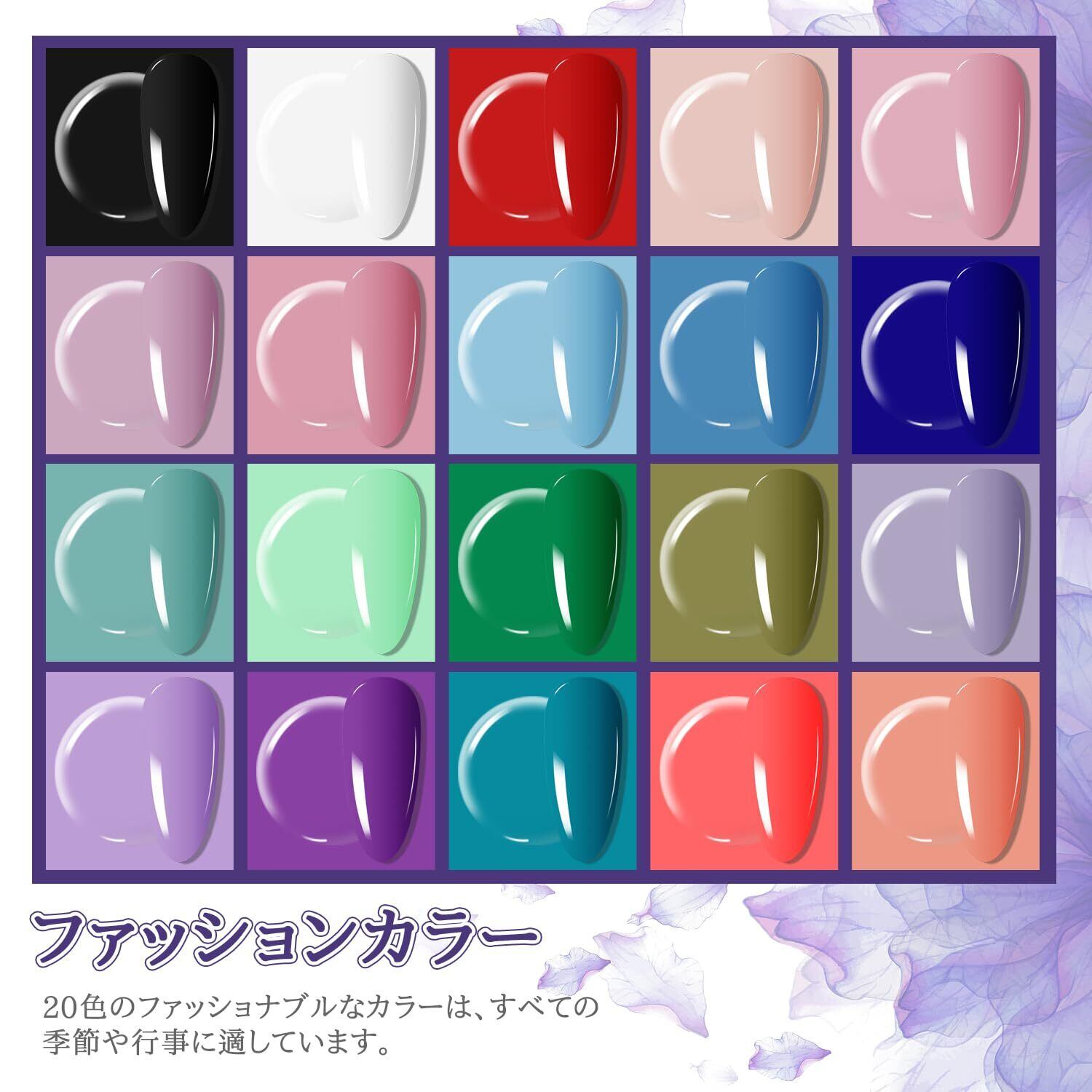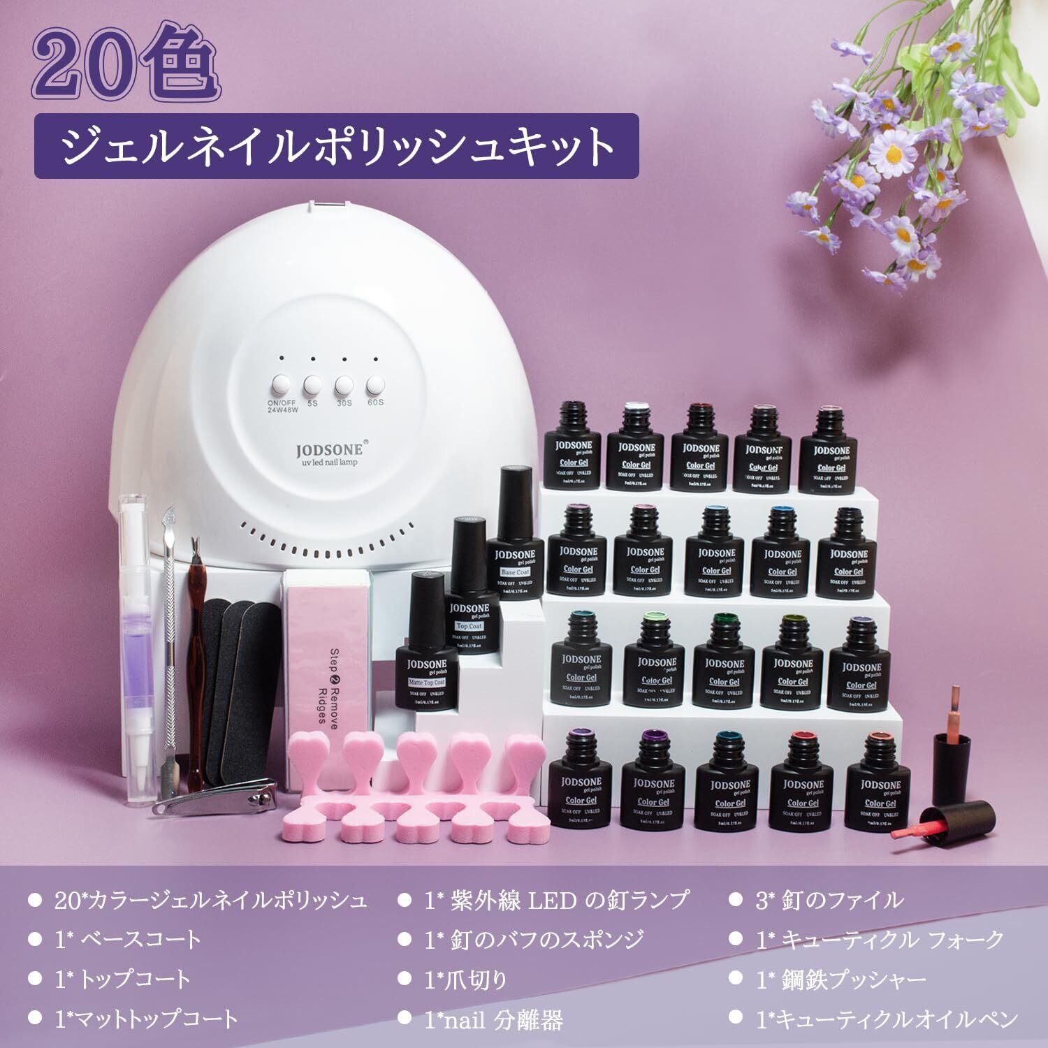 内容:容量5mlのジェルキット23本、カラージェル20本、ベースコート、グロッシーコート、マットトップコート3本。軽量ネイルランプとマニキュアツール