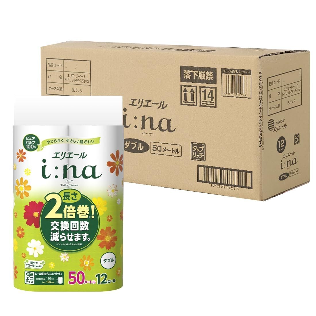エリエール トイレットペーパー i:na(イーナ) 2倍巻き 50m×36ロール(12ロール×3パック) ダブル パルプ100% 華やぐフローラルの香り 【EC限定 正規段ケース】 【ハーフケース】 【限定】