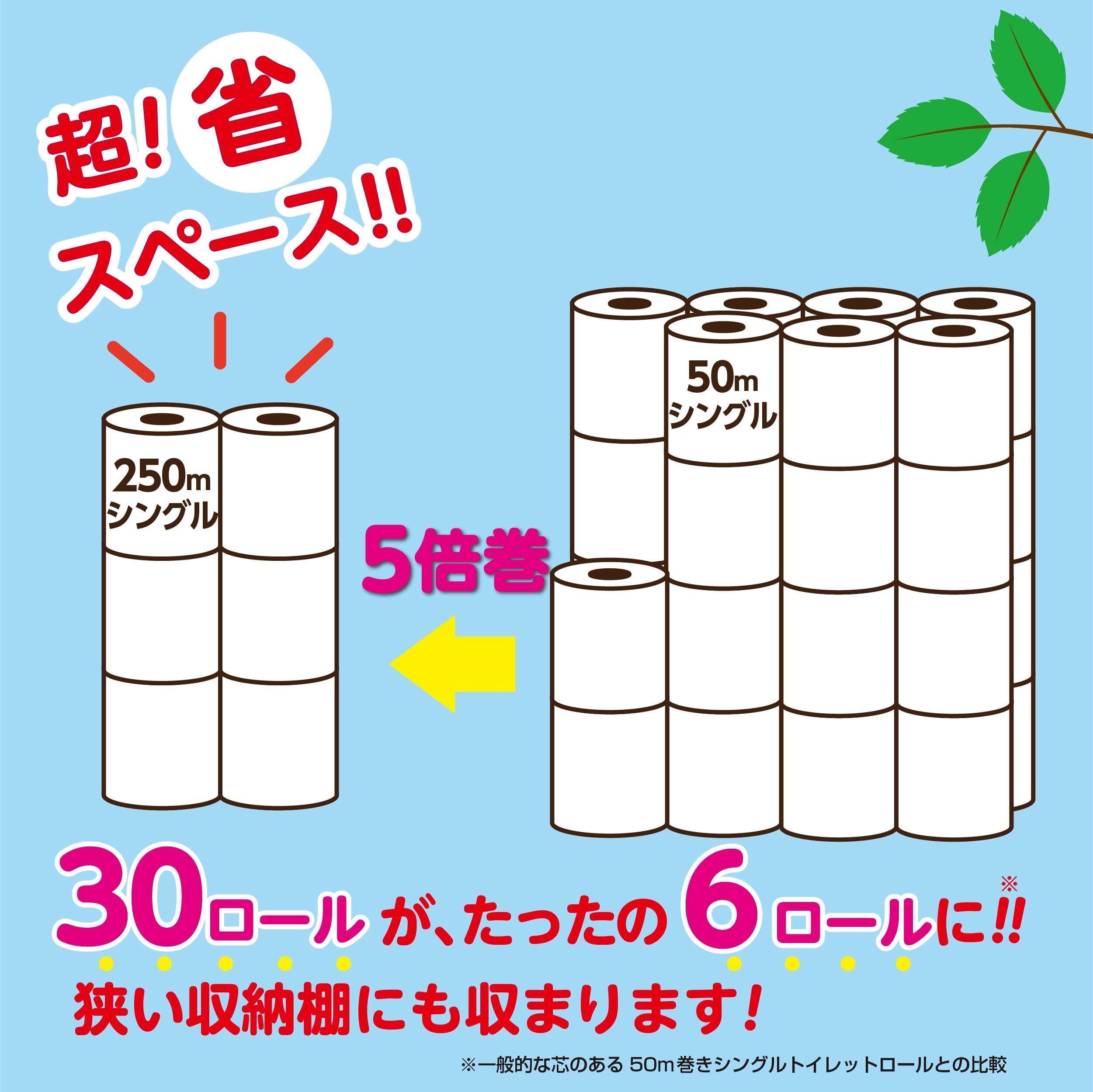 一般的なトイレットペーパー30ロール分が6ロールに。5倍巻きトイレットペーパー。