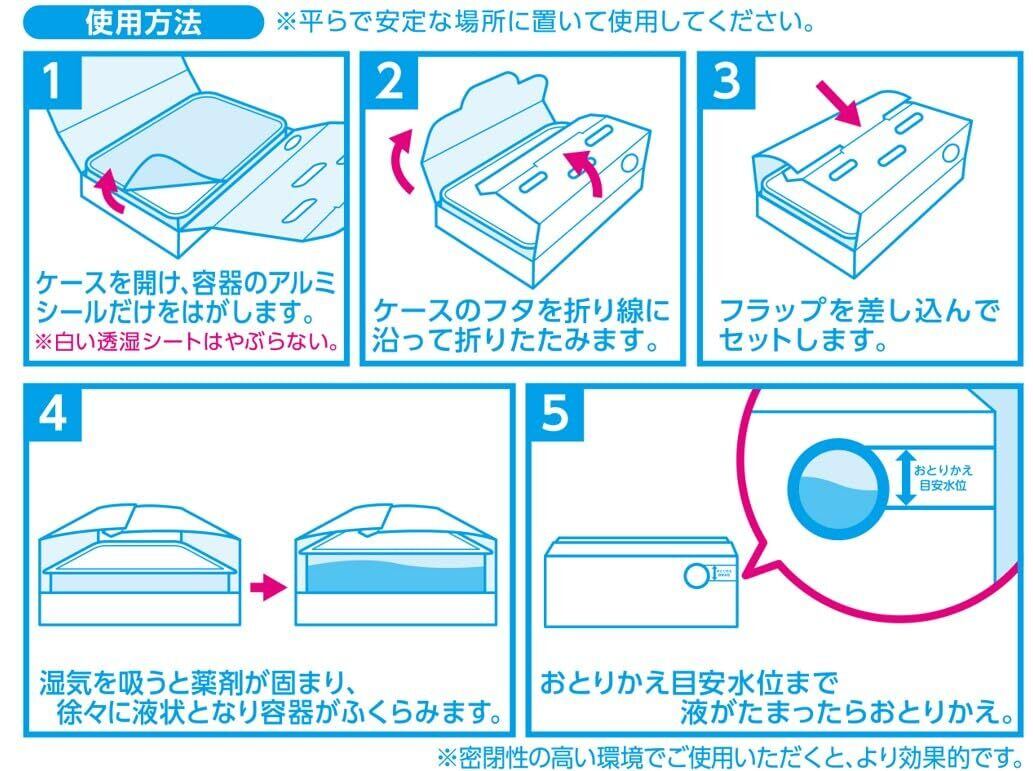 ●使用期間:4~8か月(同じ使用場所でも季節や湿気の状態で異なります。)※温度や湿気によってはおとりかえ目安水位まで液がたまらない場合がありますが使用開始後以内に必ず新しい商品とおとりかえください。
