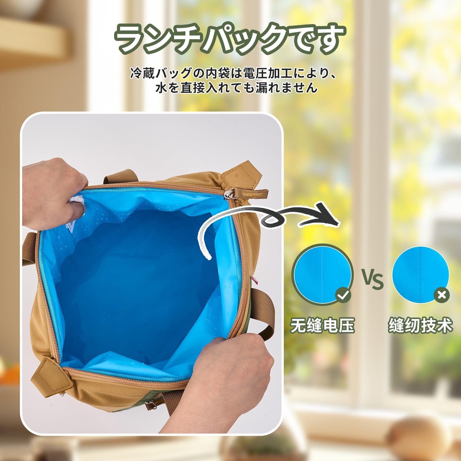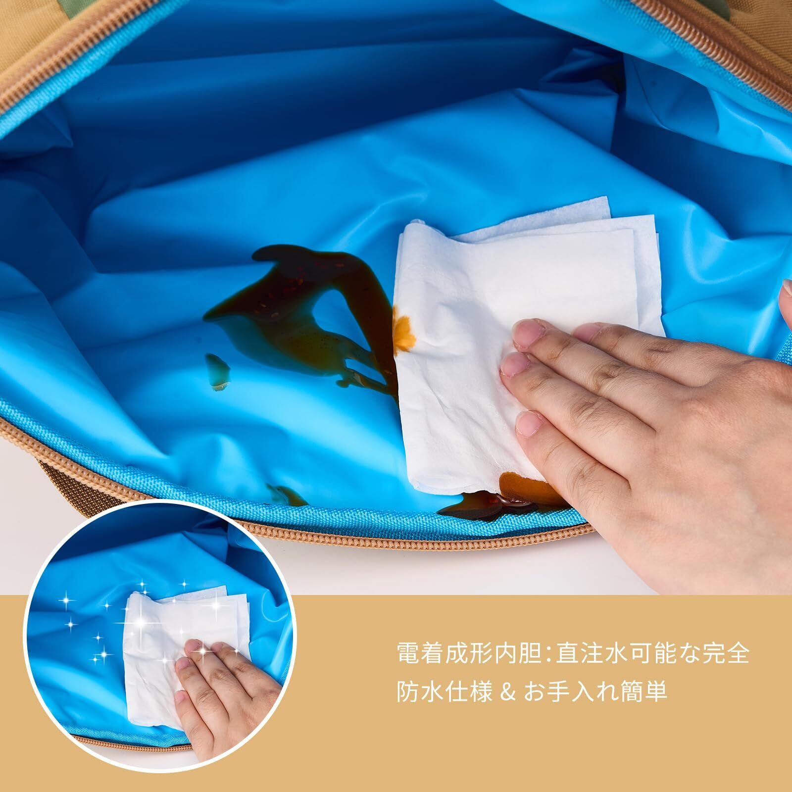 【防水・防汚素材】 外側は耐久性のある防水ポリエステル素材を使用し、雨の日でも安心。内側は拭き取りやすく、お手入れが簡単。毎日清潔に使えるランチバッグです。