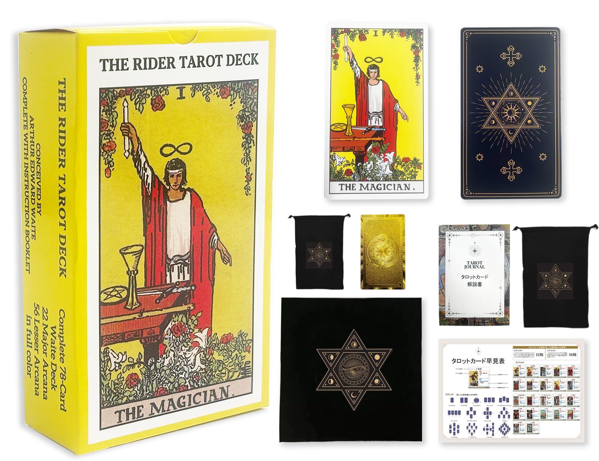 タロットカード 豪華7点セット 初心者向け(運命のゴールドカード1枚・日本語解説書・早見表・70cm大判クロス・収納袋2枚付き)ウェイト版
