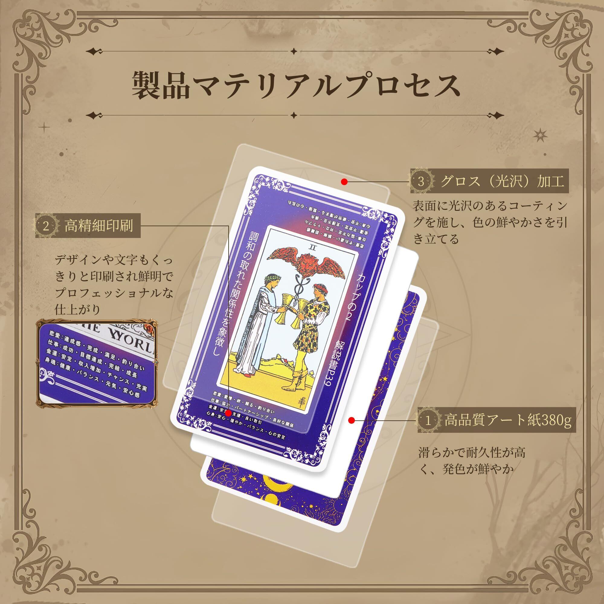【充実解説書付き】タロットの基礎知識・歴史・使い方を詳しく解説した日本語の説明書が同梱されています。初めての方でも安心して始められ、カード1枚1枚の意味をしっかり理解できるよう工夫されています。