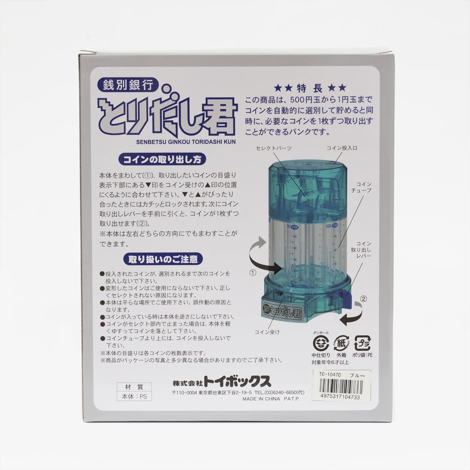 トイボックス 貯金箱 ブルー 13 x 15 x 18.7 cm 1047C 銭別銀行とりだし君 プラスチック 458.13 6歳以上
