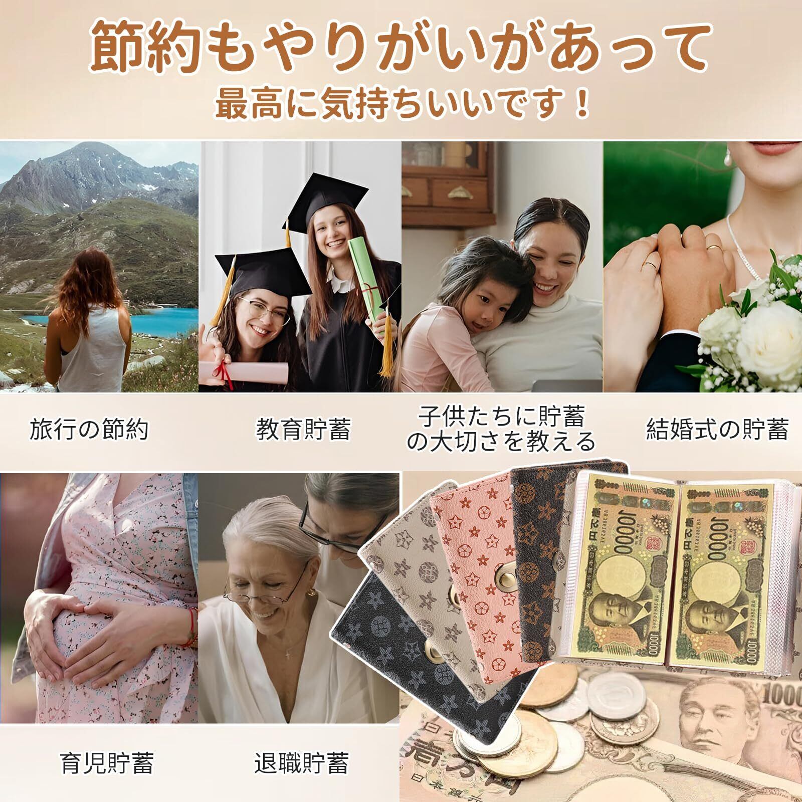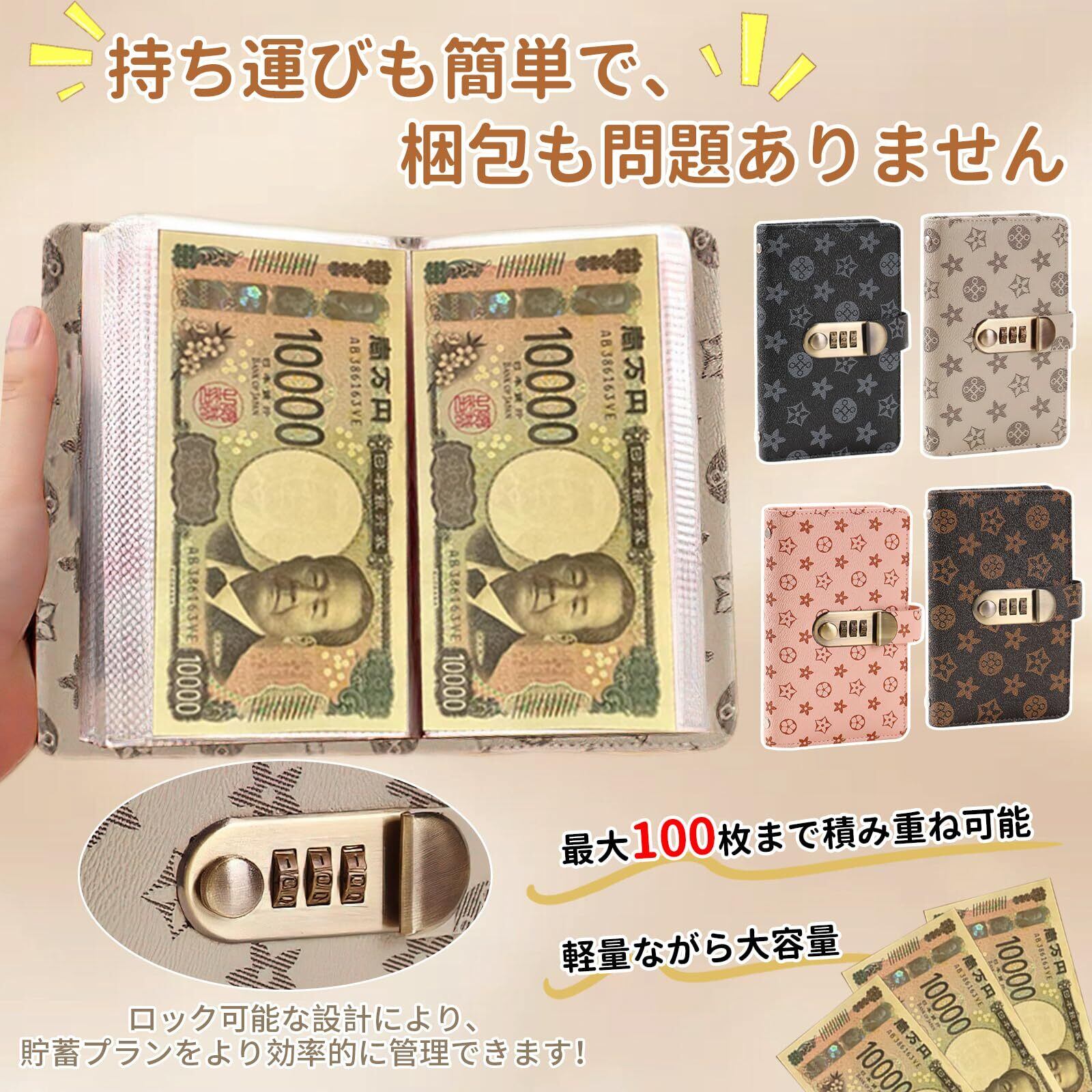 【大容量・整理しやすい】この大容量貯金箱は最大50ページ分の紙幣を収納でき、100万円貯金の目標達成をサポートします。紙幣1ページごとに専用ポケットが2つ(合計100枚収納可能)あり、1万円札を貯めるのに最適です。封筒型の収納スペースで紙幣を種類ごとに仕分けできるので、管理も簡単です。