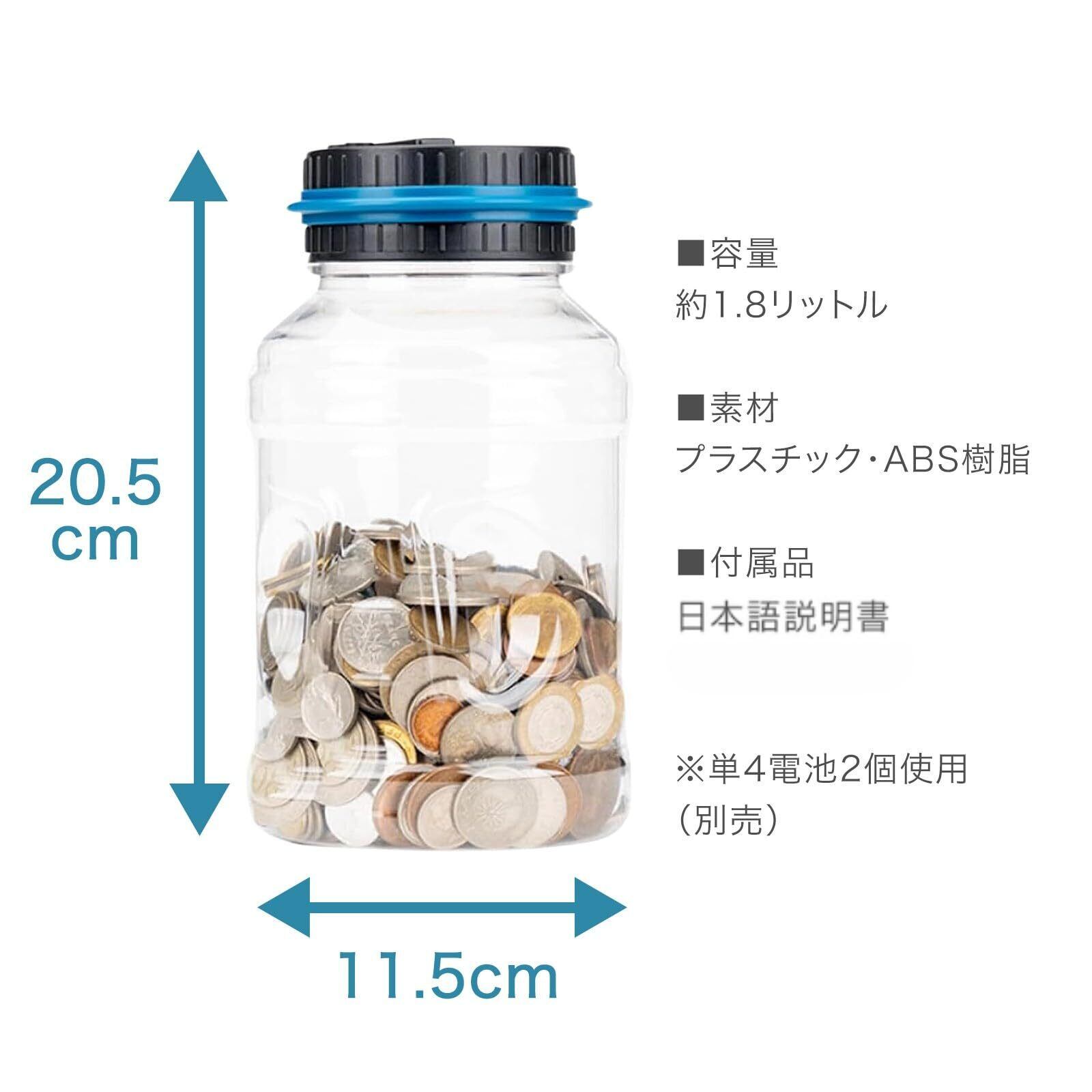 【商品詳細】 内容:貯金箱本体×1、日本語取扱説明書×1 素材:プラスチック、ABS樹脂 サイズ:約 直径11.5cm × 高さ20.5cm 容量:約1.8L(500円玉で約800枚前後収納可能) 電源:単四電池2本(別売り)