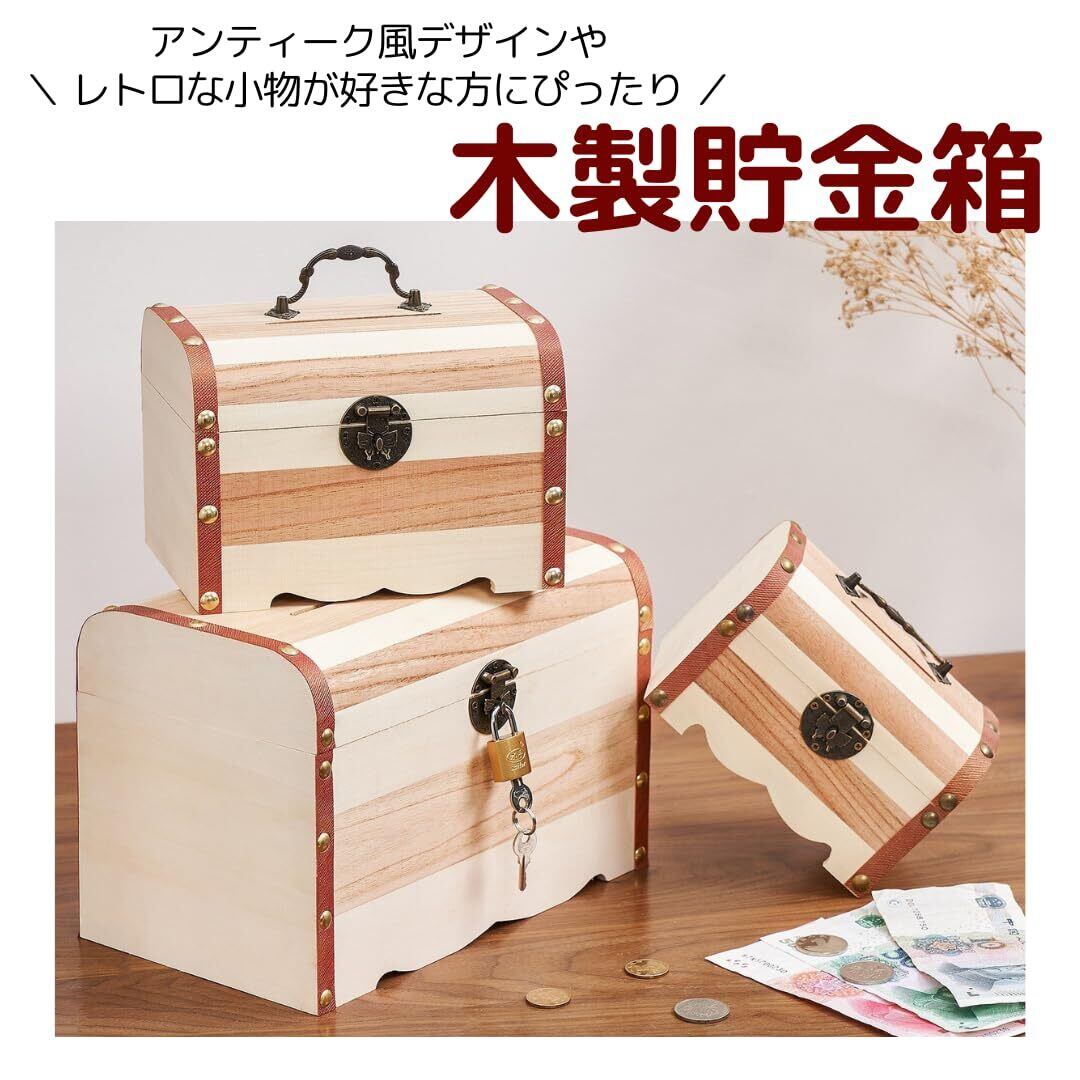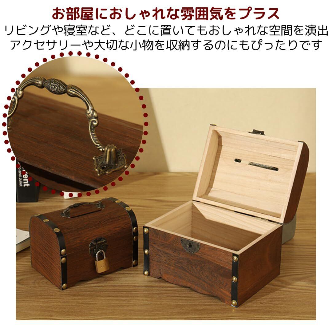 【インテリアにもなるおしゃれな貯金箱】レトロな小物やアンティーク風のデザインが好きな方にぴったりの、木製の貯金箱。温かみのある木製素材と、アンティーク調のデザインが魅力です。貯金箱としてだけでなく、インテリアとしても活躍し、お部屋におしゃれな雰囲気をプラスします。ちょっとした小物入れとしても使えるので、アクセサリーや大切な小物を収納するのにもぴったり!