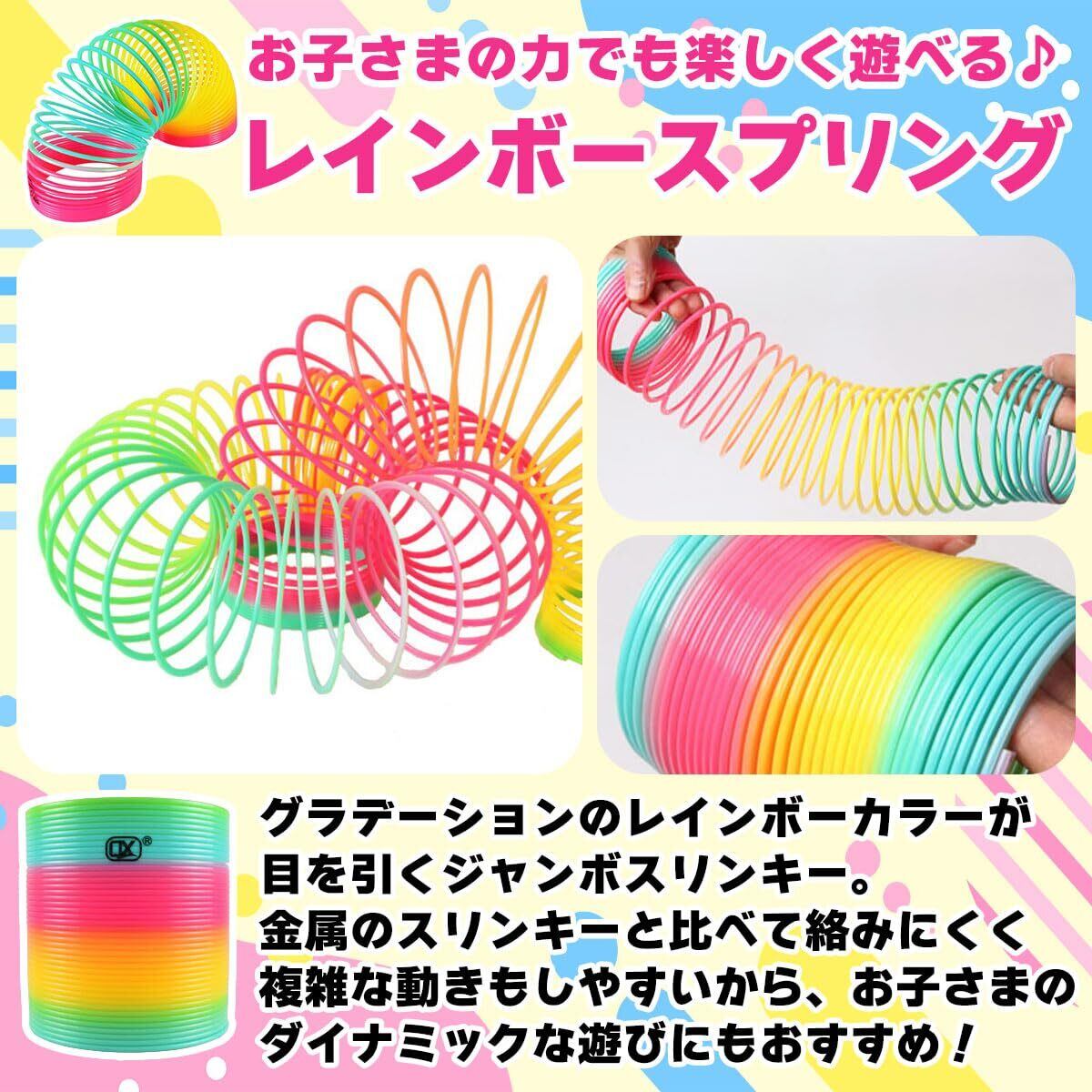 多彩な遊び方と実用性を兼ね備えた万能おもちゃ スプリングは、手元遊びやジャグリング、階段遊びだけでなく、ペン立てやメモスタンドとしても活用可能です。カラフルなレインボーデザインは視覚的に楽しく、景品や縁日の賞品としても人気があります。遊びながら運動能力や集中力を育むことができ、子供から大人まで幅広く楽しめるため、家庭や学校、イベントなど様々な場面で役立つ多目的で魅力的なおもちゃです。