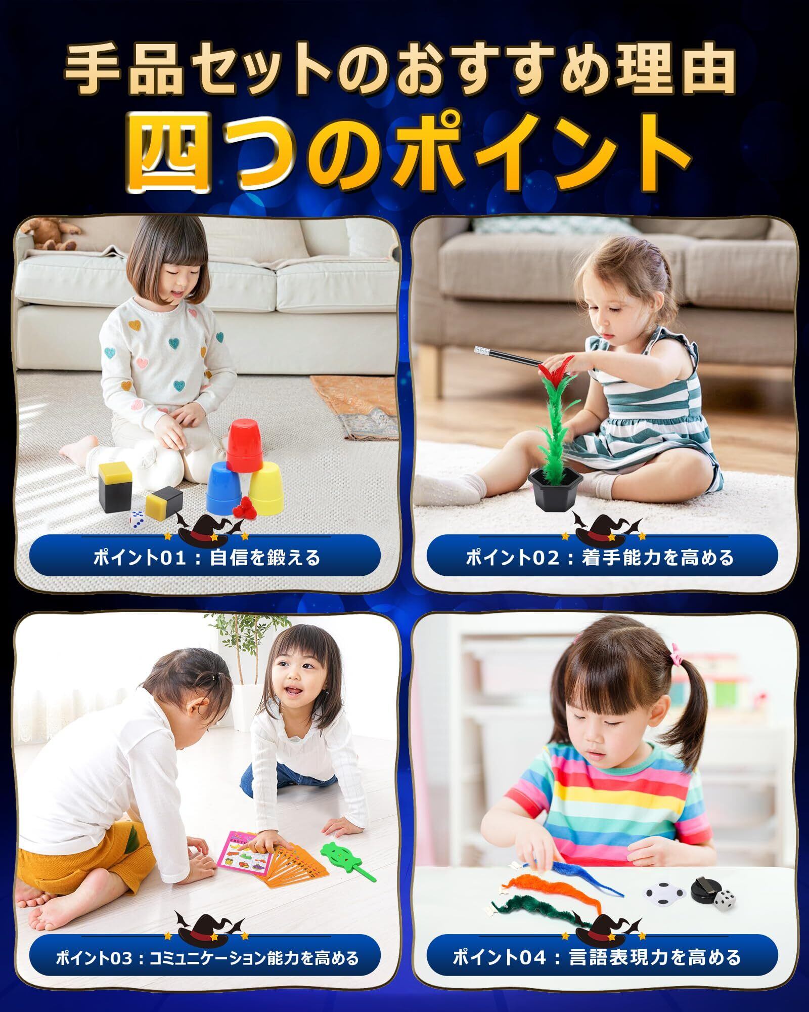 【子供初心者に手品グッズをおすすめ理由】 マジシャン顔負けの手品が披露できたら、素敵ですよね?子供におすすめ四つのポイント:ポイント01:自信を鍛える。ポイント02:着手能力を高める。ポイント03:コミュニケーション能力を高める。ポイント04:言語表現力を高める。手品用品の中でも、初級にあたるオリジナル製品をセットにしました。子供から大人まで世代を超えて愛される手品用品です。