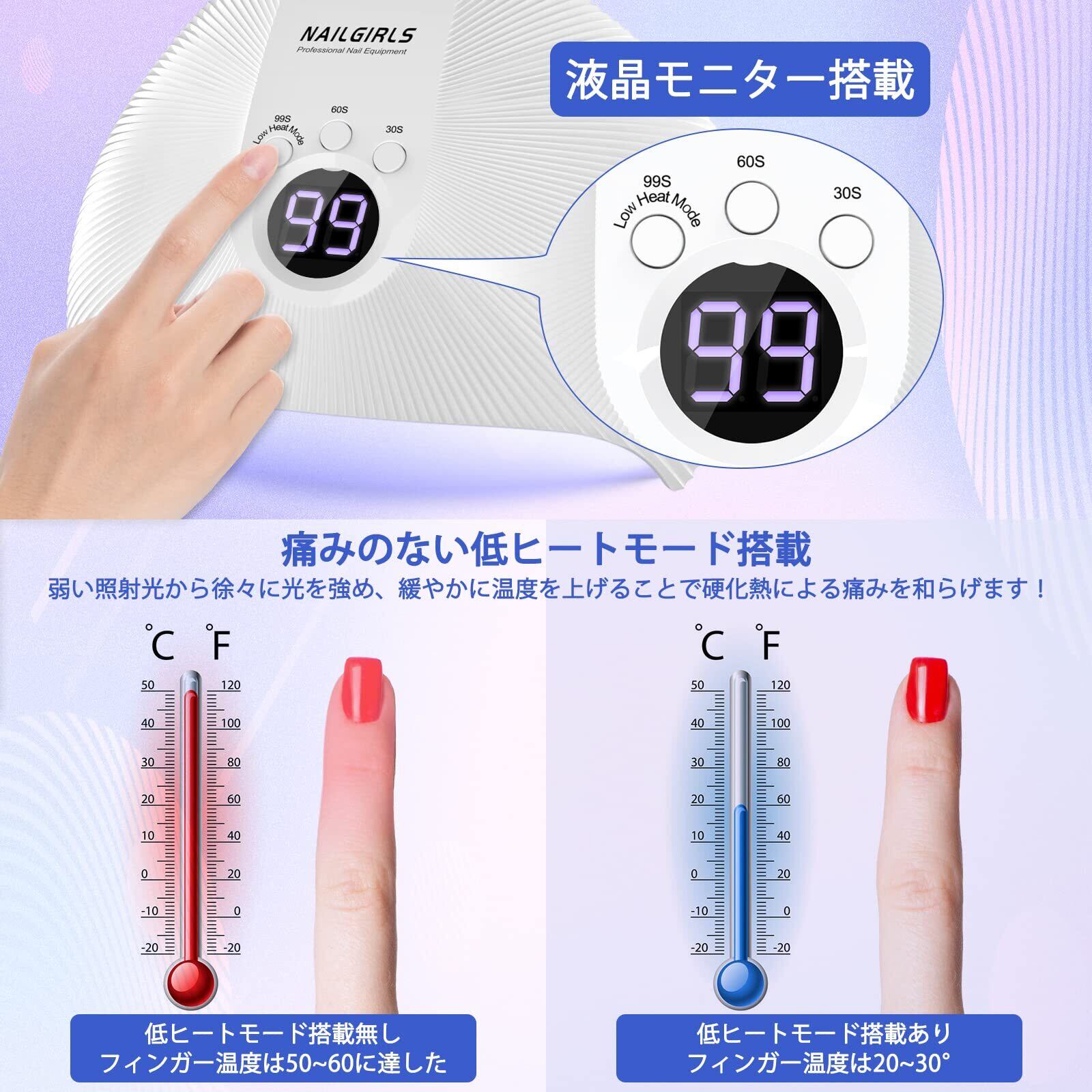 【低ヒートモード機能が付き】99sの無痛モード搭載して、温度を徐々に上げて、ジェル硬化途中による痛みを抑えることができます。紫外線や痛みに敏感する方はこの99s低ヒート無痛モードをご利用オススメです!ストレスなくジェルネイルが楽しめます!