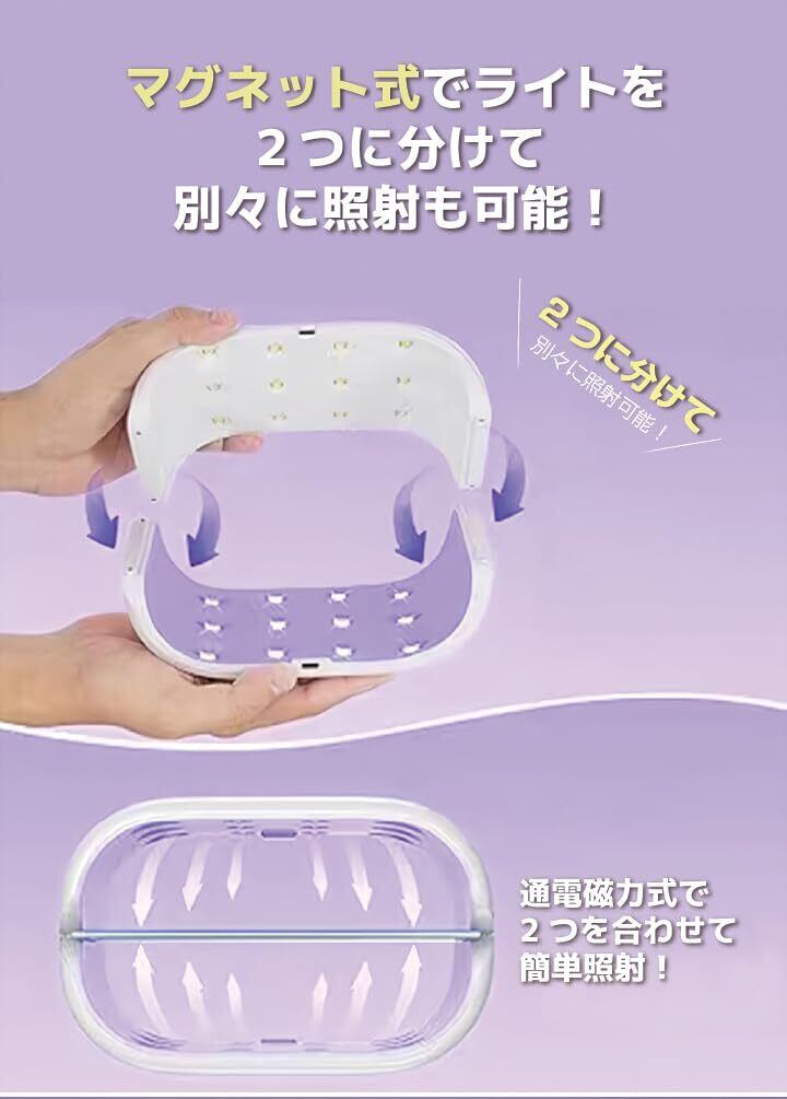 両面同時硬化:本製品は、上部と下部の両方にUVライトを搭載しております。マグネット式でピタッと重なります。これにより、レジン作品を均一に硬化させることが可能となり、従来の片面硬化と比べますと、硬化時間を最大で半分程度に短縮できる仕様となっております。