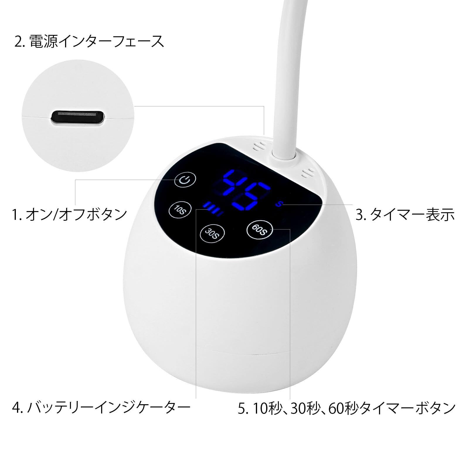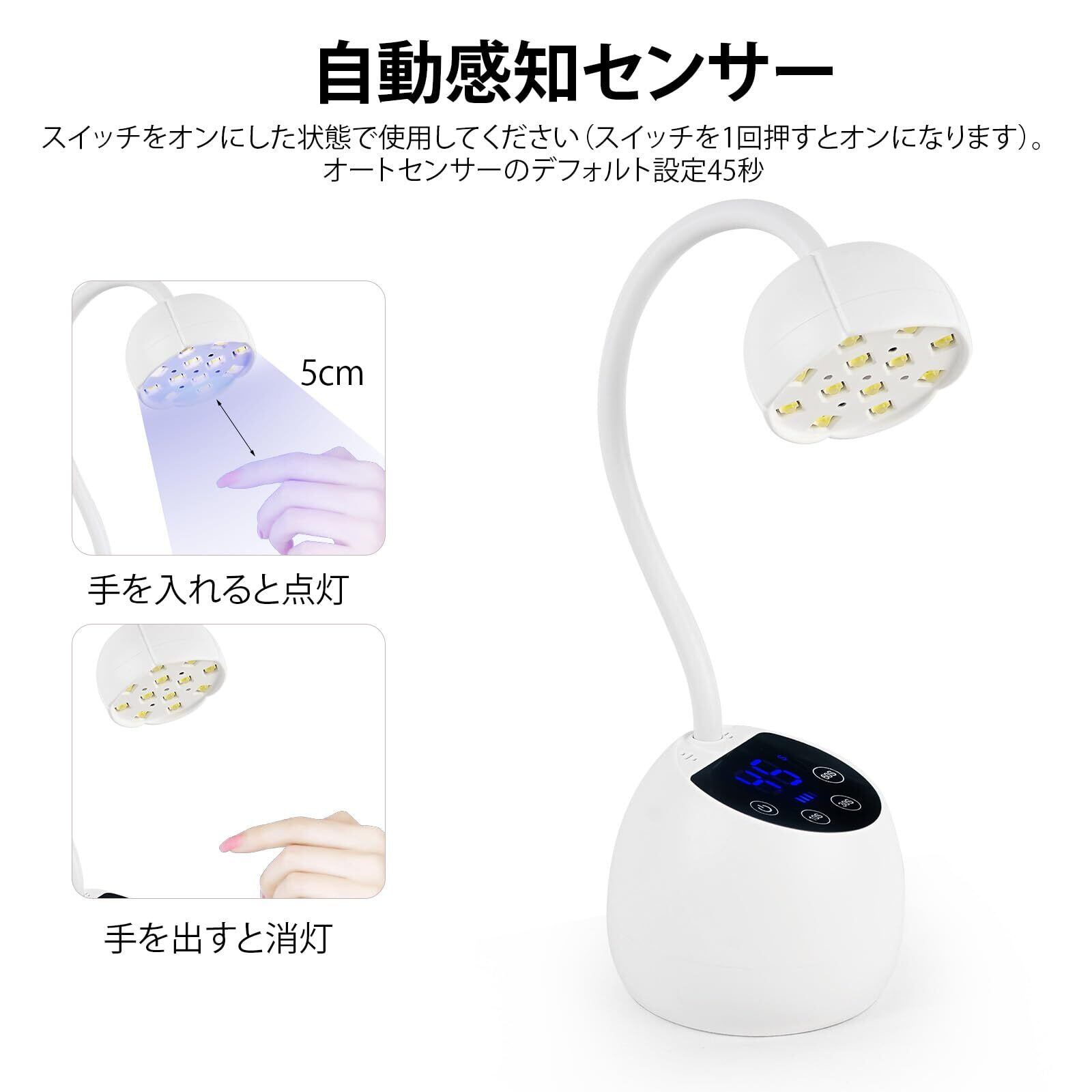 このジェルネイルライトは4段階のタイマー設定(10秒/30秒/45秒/60秒)に対応し、UVジェルネイルライトスマートセンサー搭載、デフォルトの自動センサー作動時間は45秒に設定されています。あらゆるネイル硬化ニーズにお応えします。