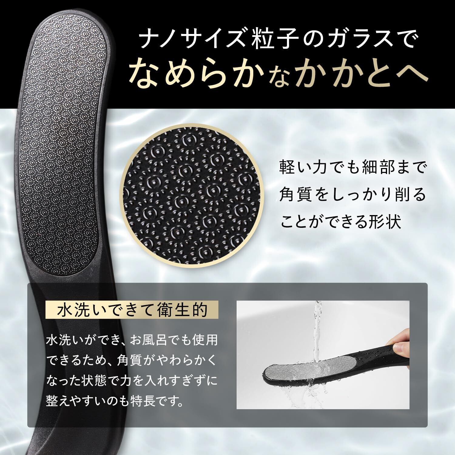 かかとやすり かかと ヤスリ 足裏 角質ケア 角質除去 フットケア ナノガラス ガラスやすり かかとケア 皮膚科医監修 水洗い可能 持ち手付き S字形状 自宅ケア 角質ケアグッズ フットケア用品