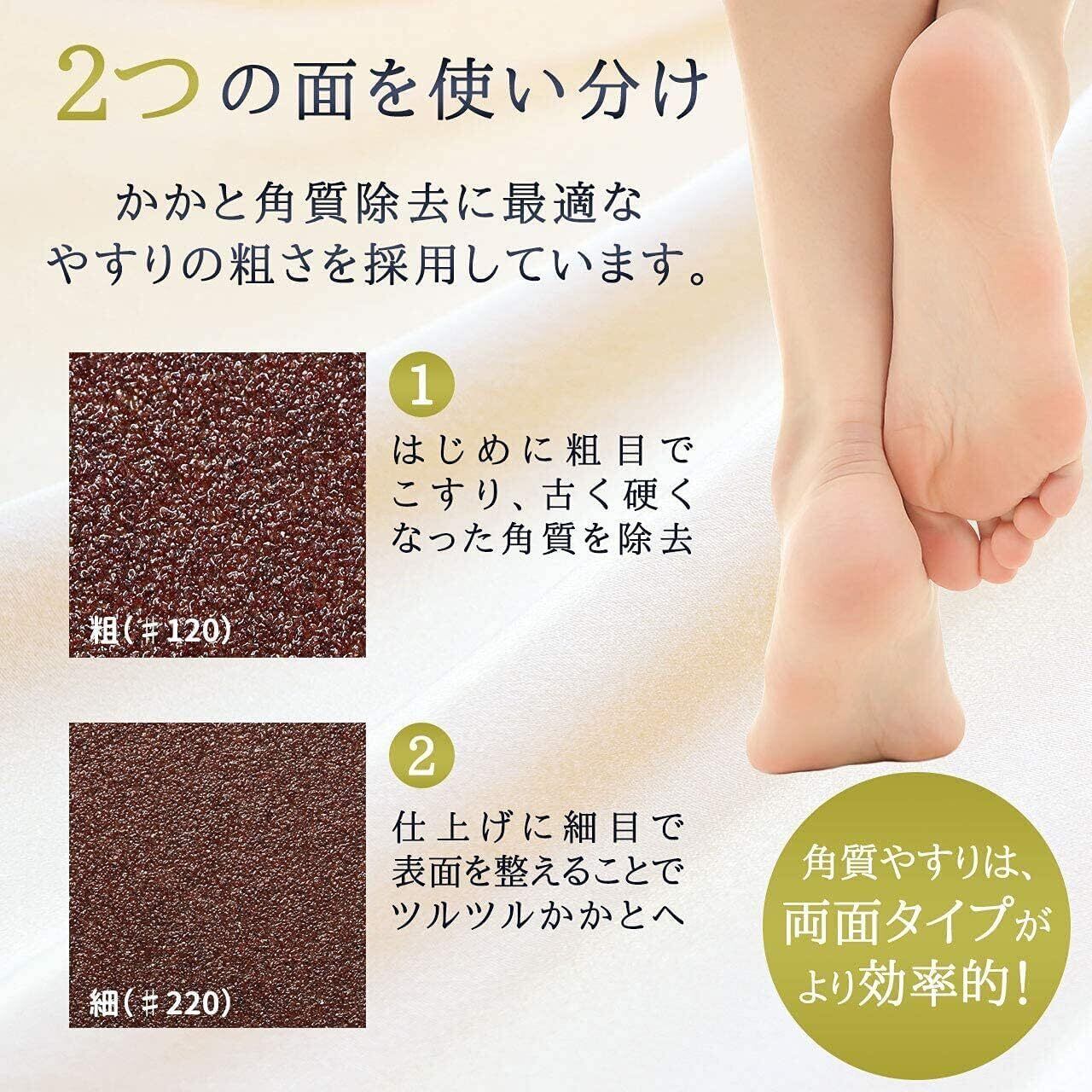 【用途】角質の状態によって使い分けることができる両面タイプの商品です。粗く分厚い角質を除去し、きれいでしっとり美しい足を作ることができます。