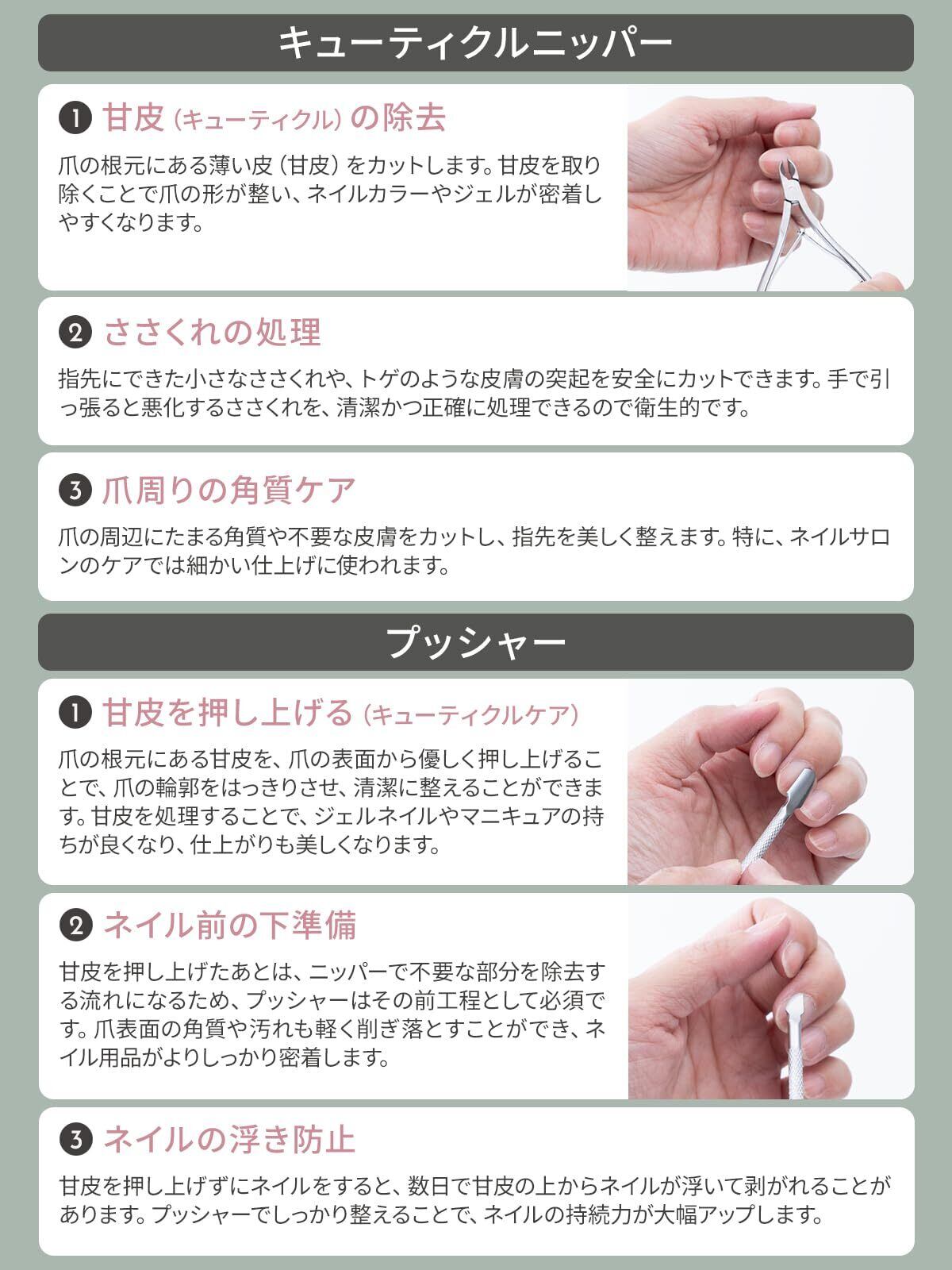 【これひとつで“自分でできる”を叶える4点セット】キューティクルニッパー、やすり、キューティクルトリマー、プッシャーの基本ツールがすべて揃っています。初めてでも迷わずスタートできる内容で自宅でのセルフケアに最適です。