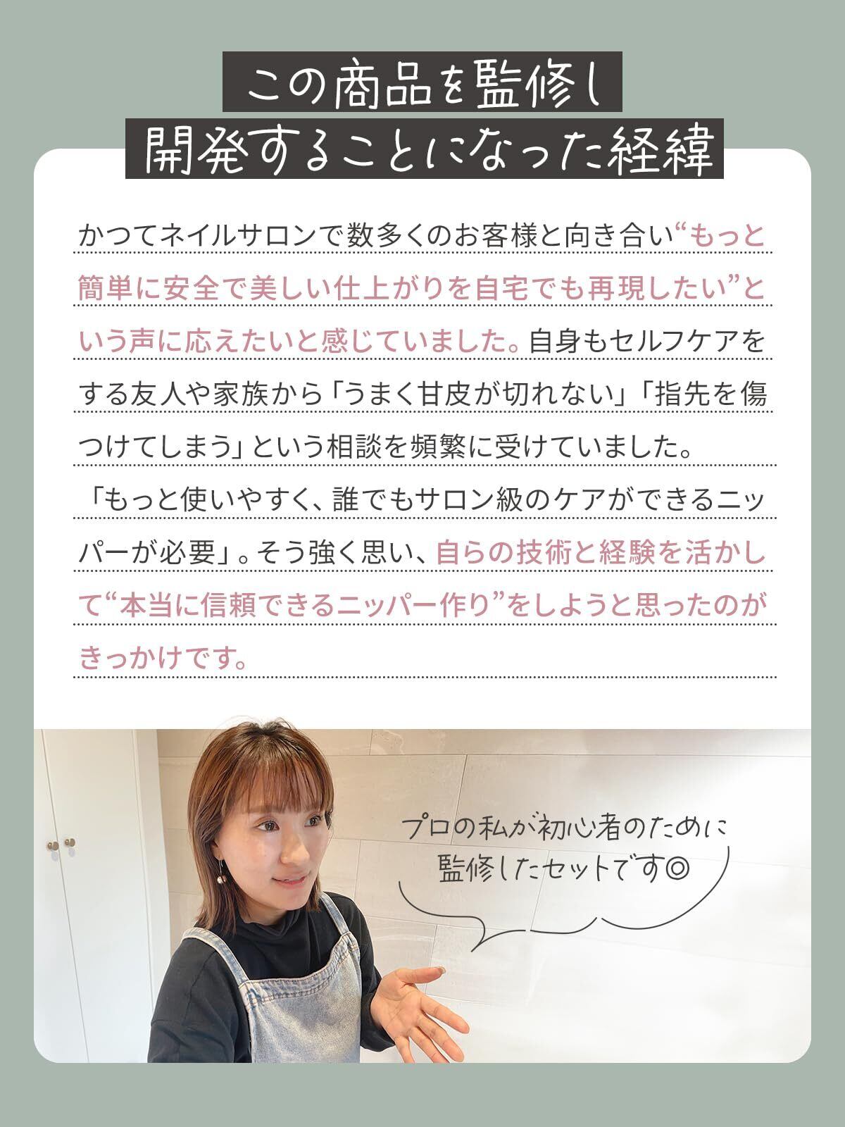 【1級ネイリスト監修。お客様の声から生まれたネイルケアセット】「セルフでネイルケアをしてみたいけど、どれを選べばいいかわからない」そんな声に応えるために1級ネイリストが監修。実際のお客様の意見を取り入れ、初心者でも扱いやすく設計しました。