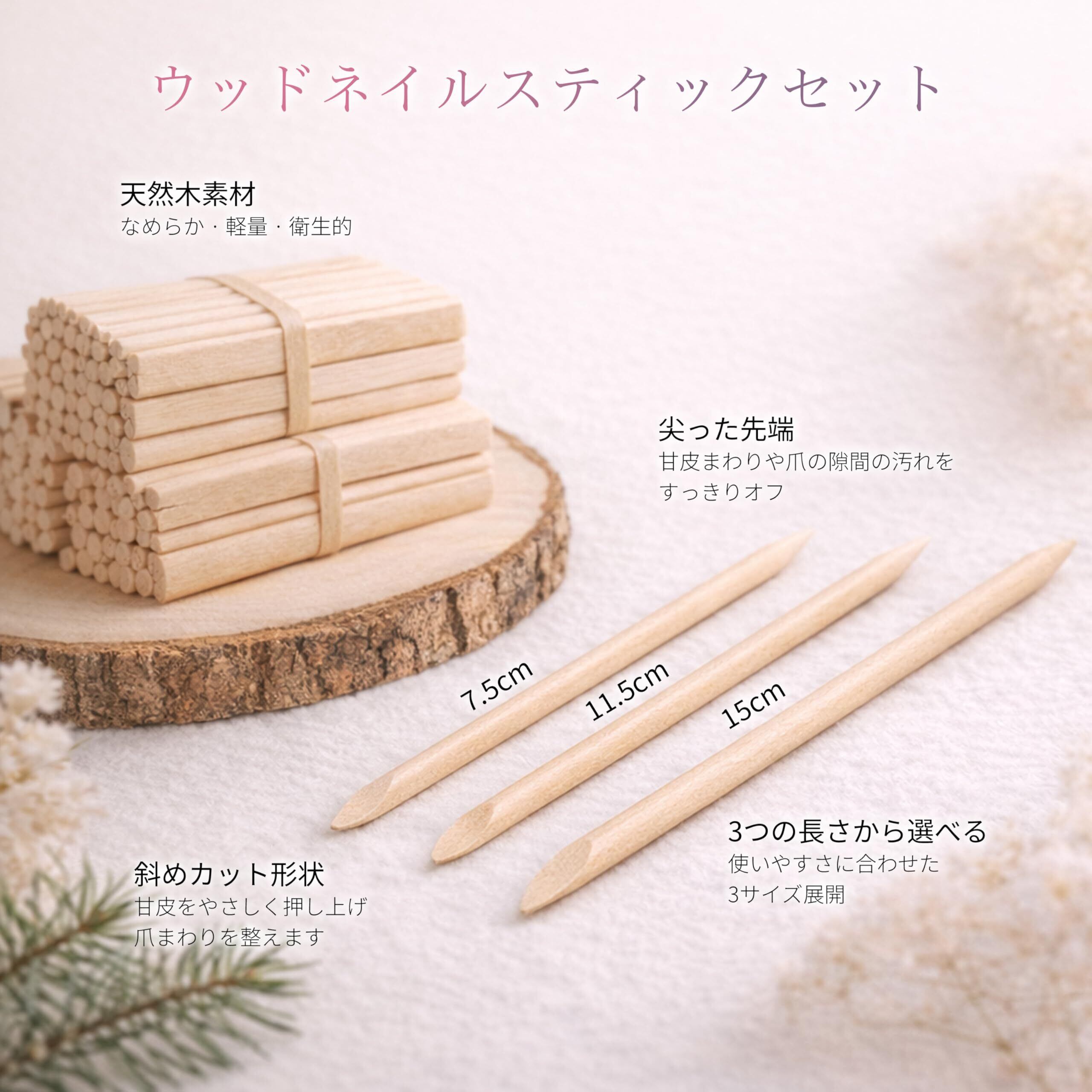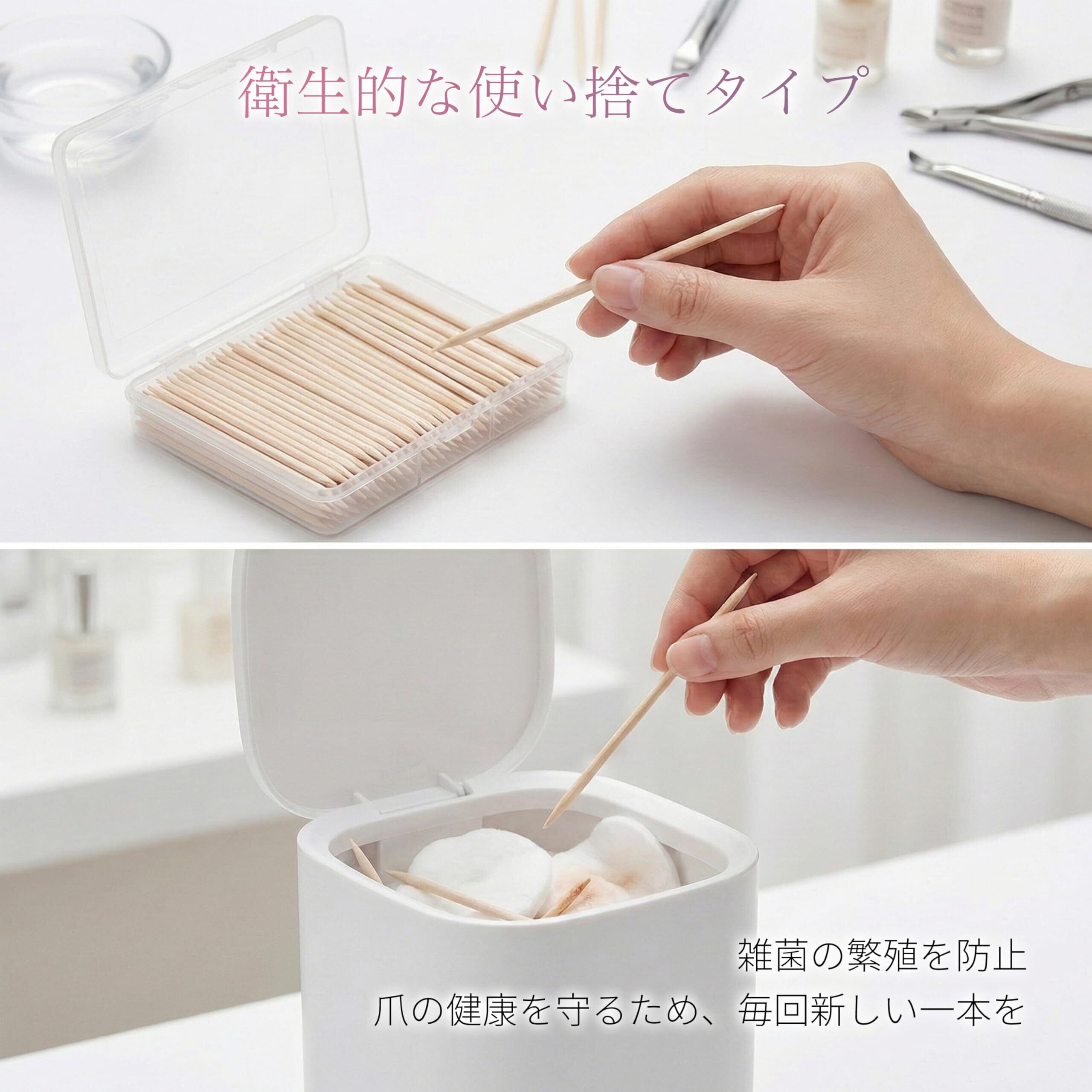 【軽量で扱いやすい木製・使い捨てで衛生的】天然木で持ちやすく、1 本ずつ清潔に使用可能。セルフネイルにもサロンの消耗品にも使いやすい仕様。