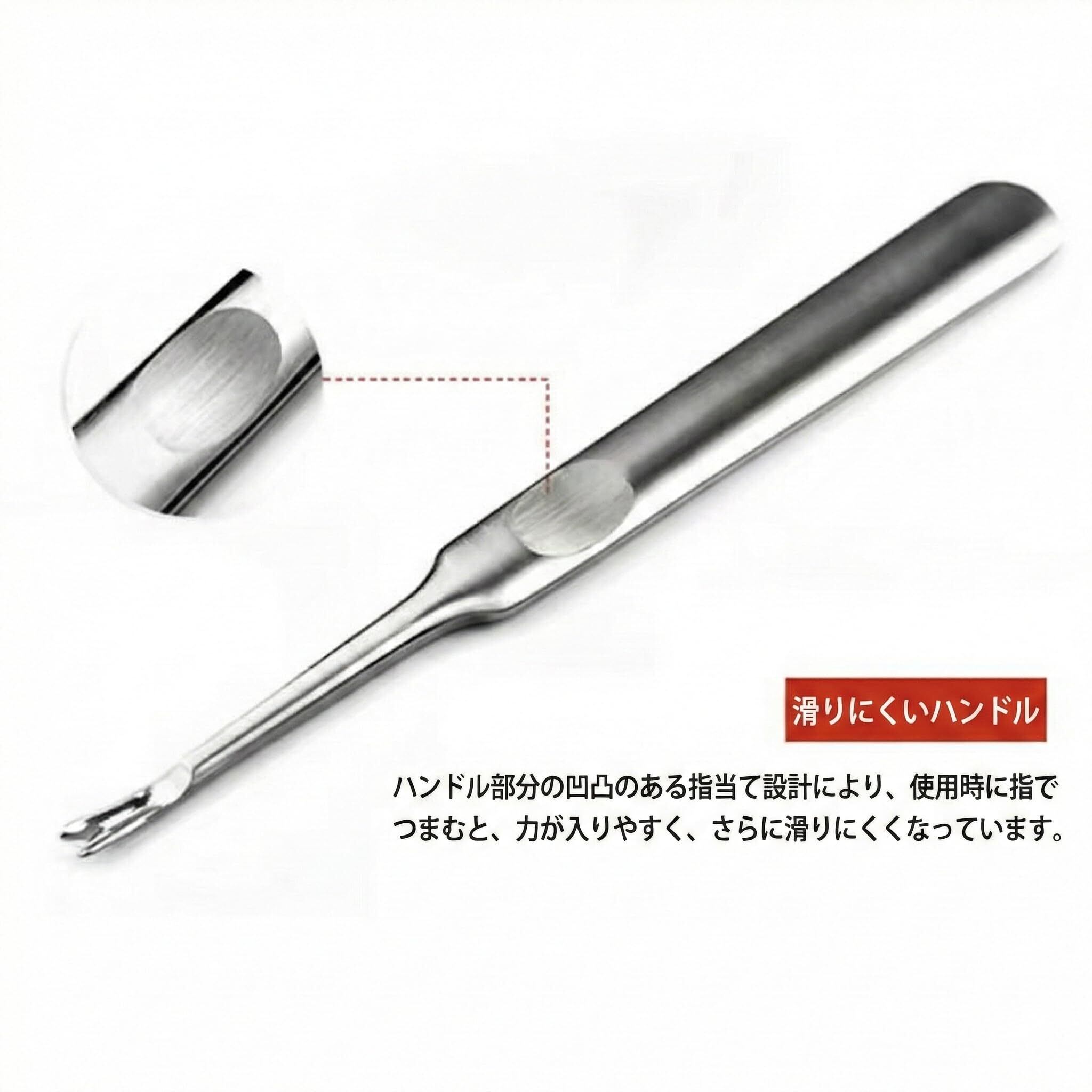 【プロ設計・扱いやすいデザイン】 ネイルケアのプロ目線で設計。シンプル構造で初めての方でも迷わず使えるキューティクルケアツールです。 【シャープなV字型ニッパー】 鋭すぎず安全性を考慮したV字形状。キューティクルやささくれ(ハングネイル)を素早く、きれいにカットできます。 【手・足の甘皮・角質ケアに】 指先や足元の不要な甘皮・古い角質を除去し、清潔感のある指先へ。ネイルアート前の下処理にも最適。 【自宅用・プロ用どちらにも対応】 セルフネイル、サロンワーク、フットケアなど幅広く活躍。家庭用としてもプロ用としても使える万能ツールです。 【錆びにくいステンレス製】 丈夫で清潔に保ちやすいステンレススチール素材。お手入れも簡単で、長く使えます。
