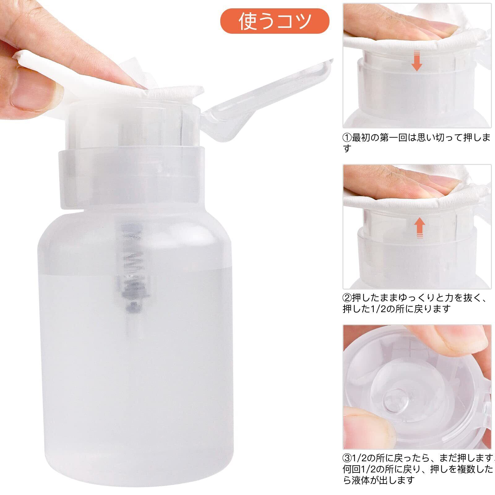 ジェルリムーバー、ポリッシュリムーバー、クレンザーなどを入れて使用することができる、便利なポンプタイプのディスペンサーです。
