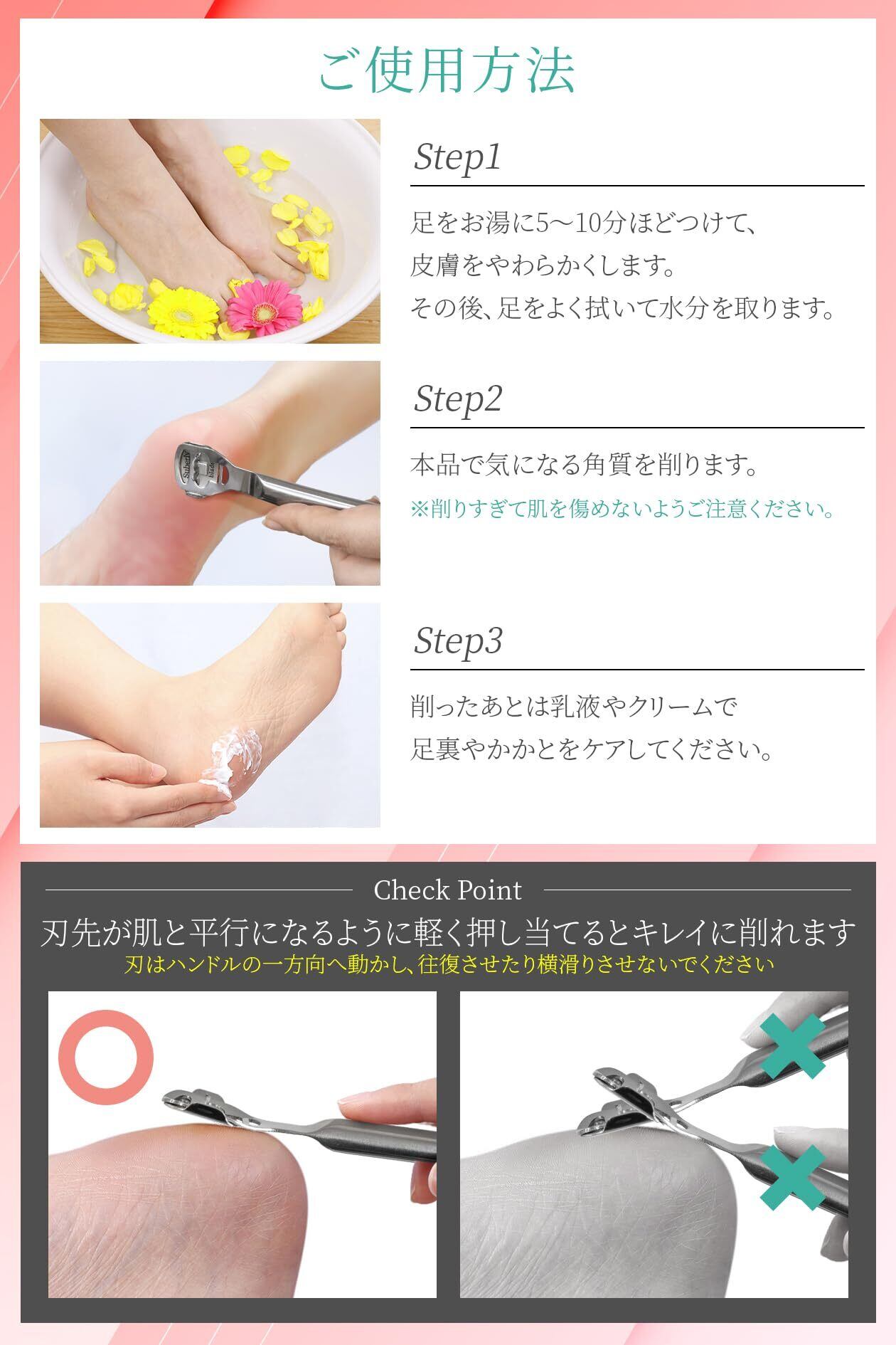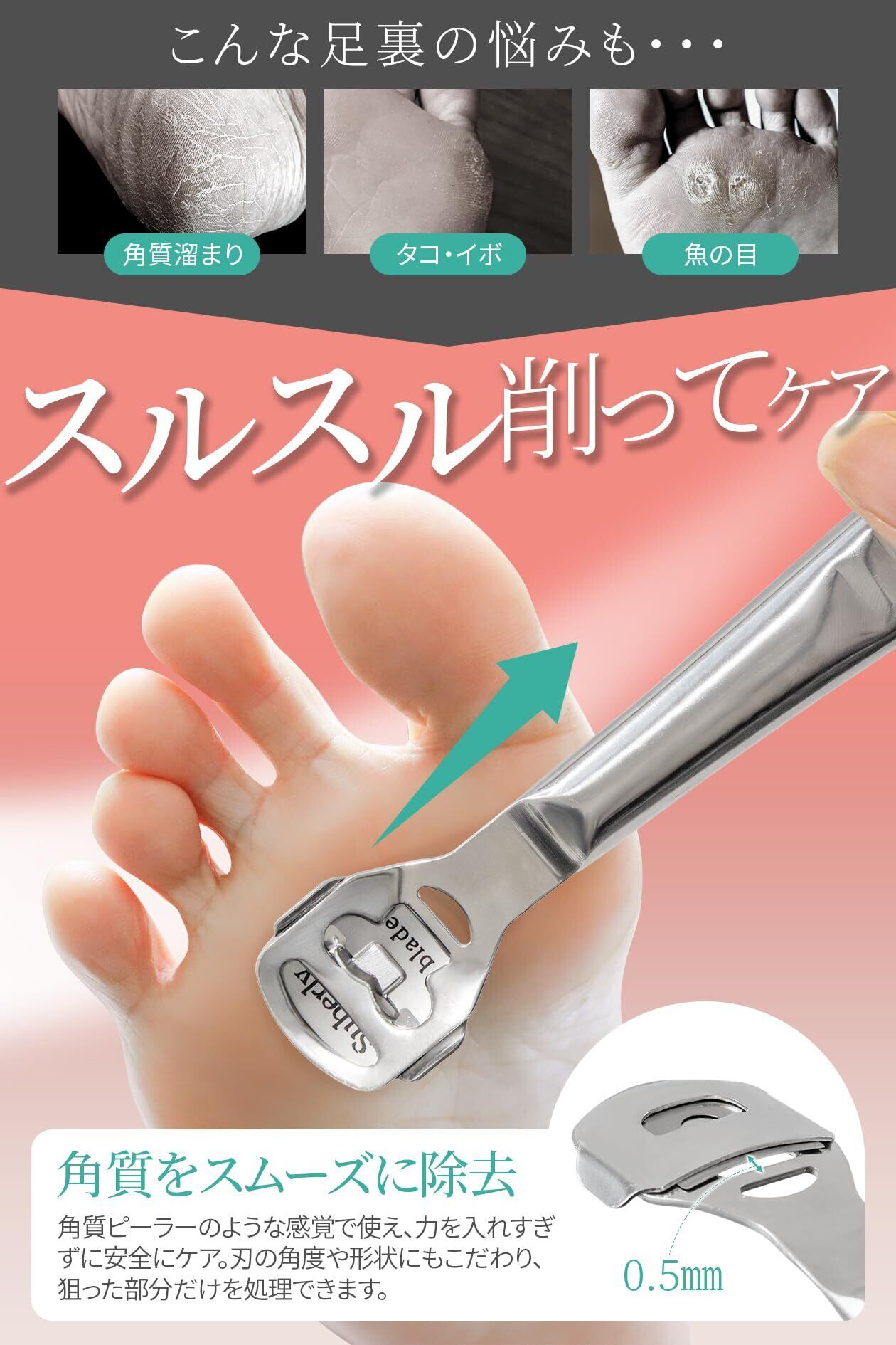 【切れ味と安全性を両立】 刃物を使うのはちょっと怖い…そんな方でも安心して使ってほしいから。適度な重みとフィット感のあるデザインで軽い力でもスムーズに削るボディデザインに加え、細部まで精密加工された刃を採用。無駄に皮膚を傷つけることなく必要な角質だけを除去するので初心者でも扱いやすいかかと削り・うおのめ除去アイテムです。(※お肌を傷めないよう、力を入れすぎず適度な頻度でご使用ください)