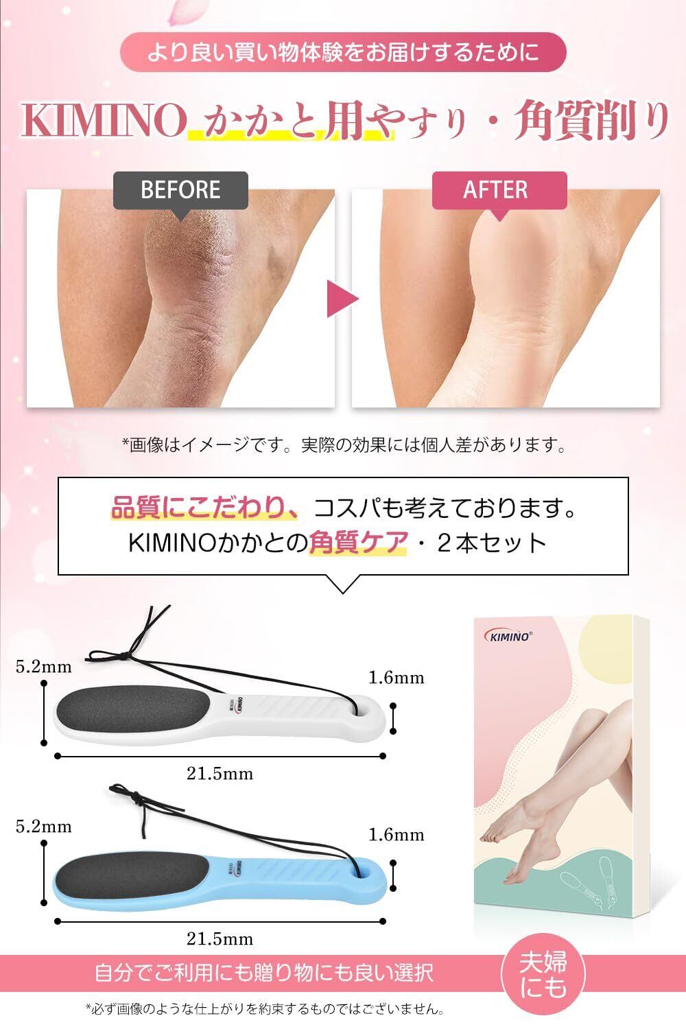 【プチギフトにも最適!】サロンクオリティの足裏角質ケアが、自宅で手軽に行えます。KIMINO かかとやすりは、かかとの角質を取り除き、ふわふわつるつるの足裏に変身させることができます。誰でも簡単に利用できるのが特長です。※ふわふわつるつるとは、足裏の角質を除去しケアすることで得られる効果です。