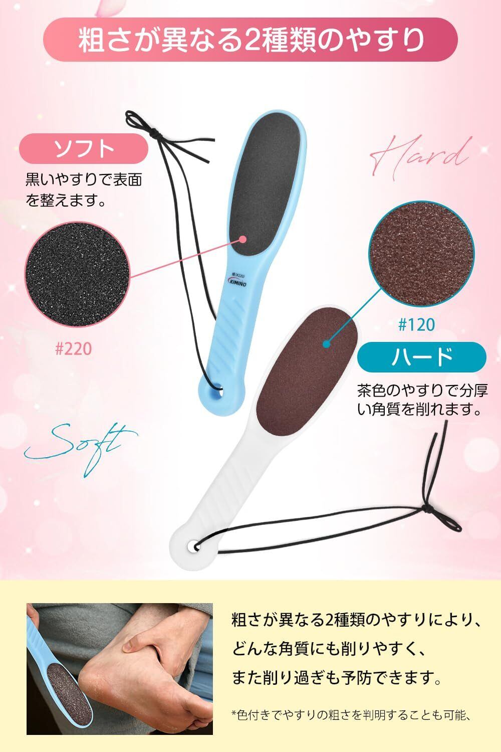 【簡単 3 ステップでツルツルなかかとへ】#120 の粗い面で硬くなった角質を取り除き、#220 の細かい面で足全体の肌をなめらかでツヤツヤに整えます。角質の状態によって 2 種類の面をご利用いただけると、誰でもプロの仕上がりに。保湿クリームで、より「ツルツルなかかと」へ導きます。