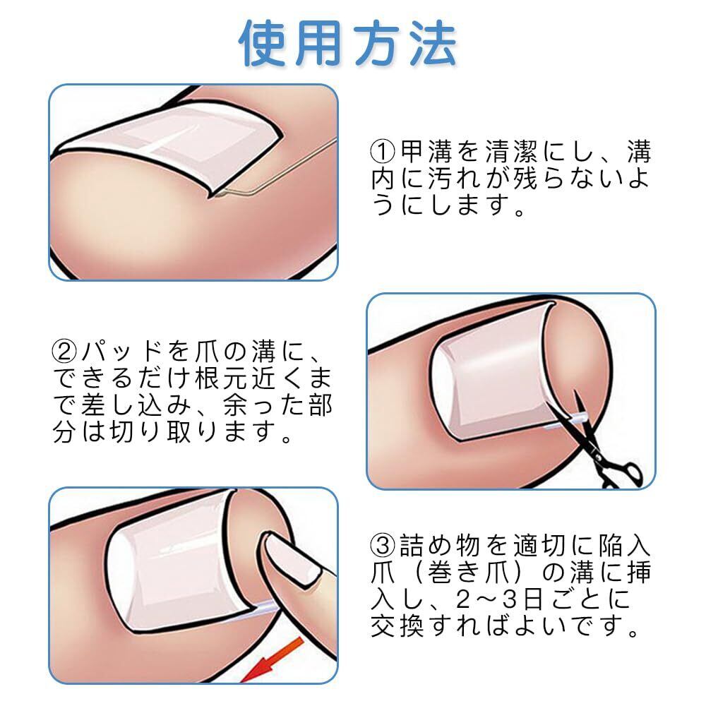 【効果的な使用手順】1.入浴後など爪が柔らかい状態で、付属ツールで爪周りを清掃。2.クリップを爪の縁に沿って優しくセット。3.はみ出た部分や長さを爪切りで整え、完成。