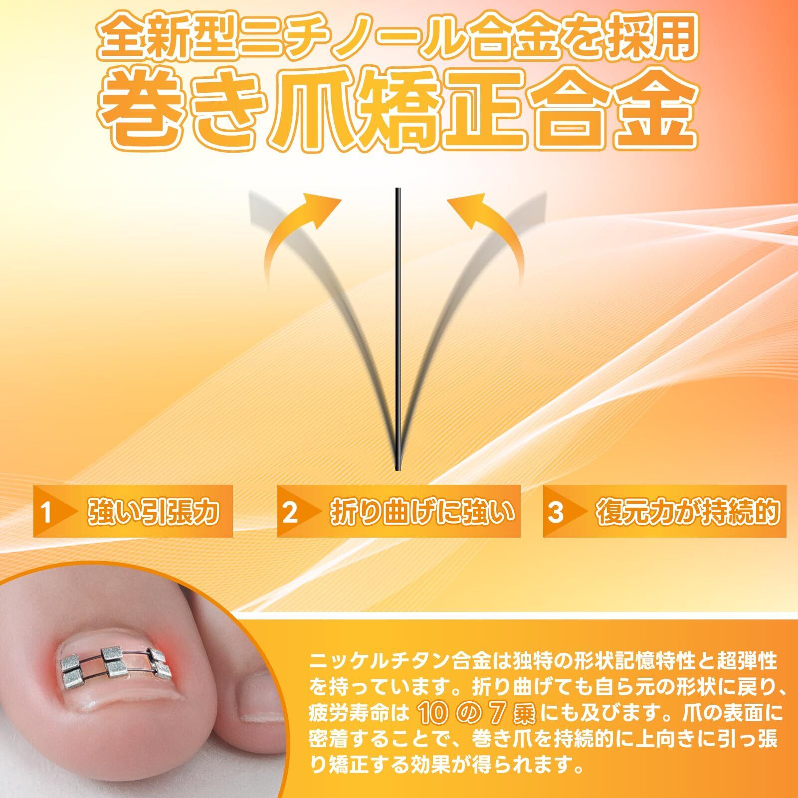 【矯正原理と効果の仕組み】本品はニッケルチタン合金ワイヤーの弾性引張力を活用し、物理的な力で巻き爪の「異常な成長方向」に干渉。爪を自然な形状へ誘導することで、爪周囲への圧迫を根本から解消し、甲周炎(嵌甲)による痛みを緩和すると同時に、再発のリスクを低減させます。