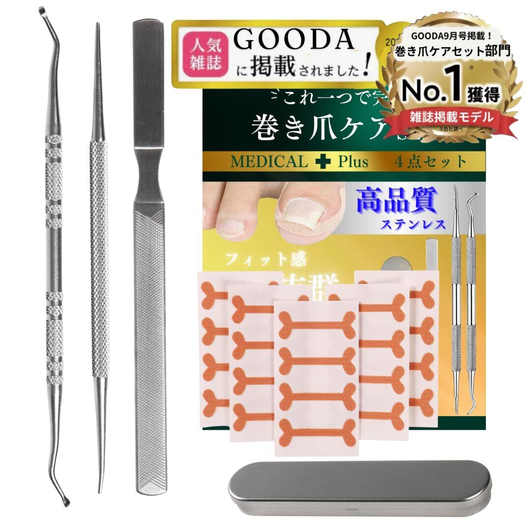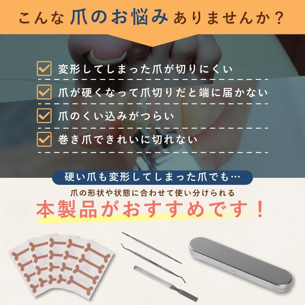 これ一つで巻き爪ケアは充分!という4点セットをご用意致しました。このセットには爪垢取りと爪やすり、巻き爪用テープが含まれており、特に巻き爪を持つ方々に有効なケアを提供します。