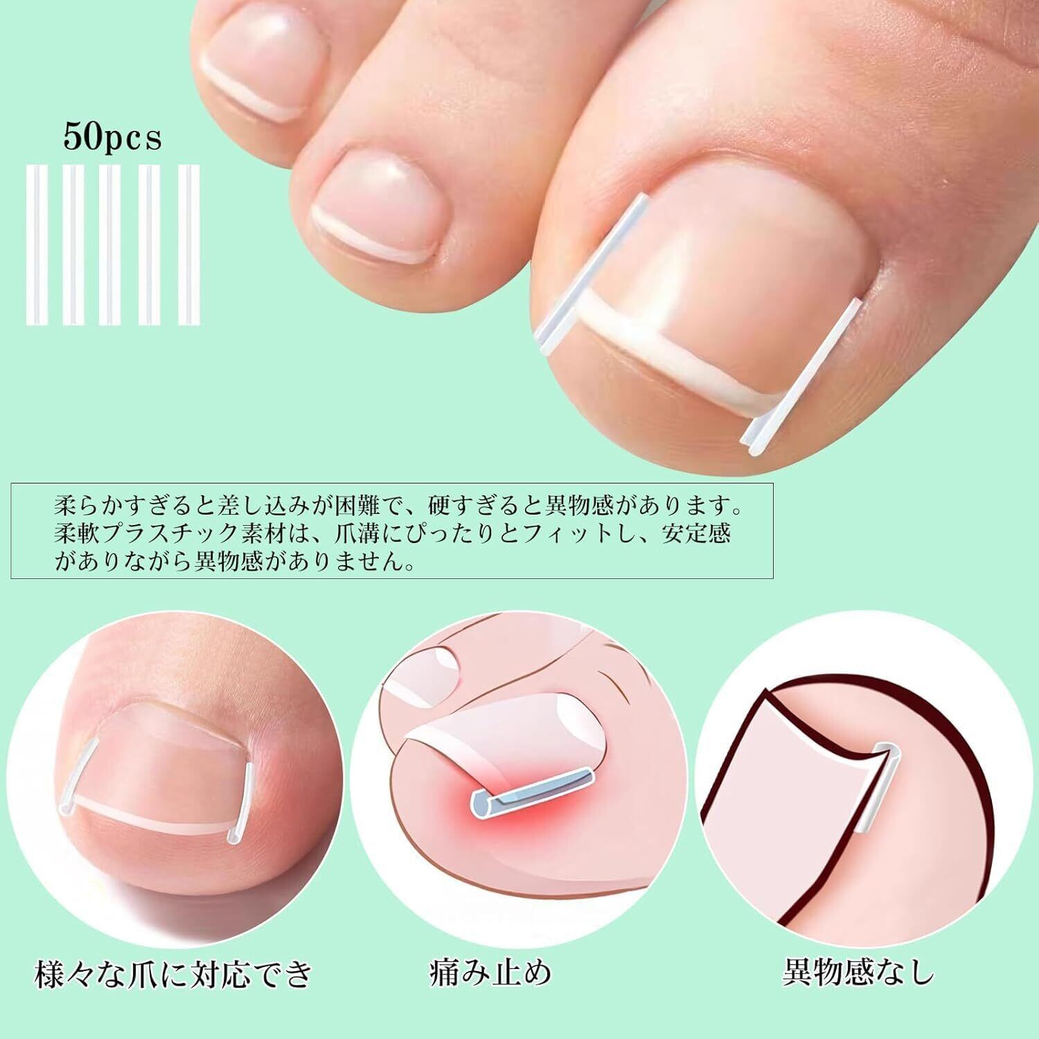 【商品説明】セット内容:クリップ×50、ネイルケアツール×1、爪切り×1。開口部デザインの巻き爪クリップはサイズを自由に調整可能で、様々な爪に対応でき、効果的な痛み止めアイテムです