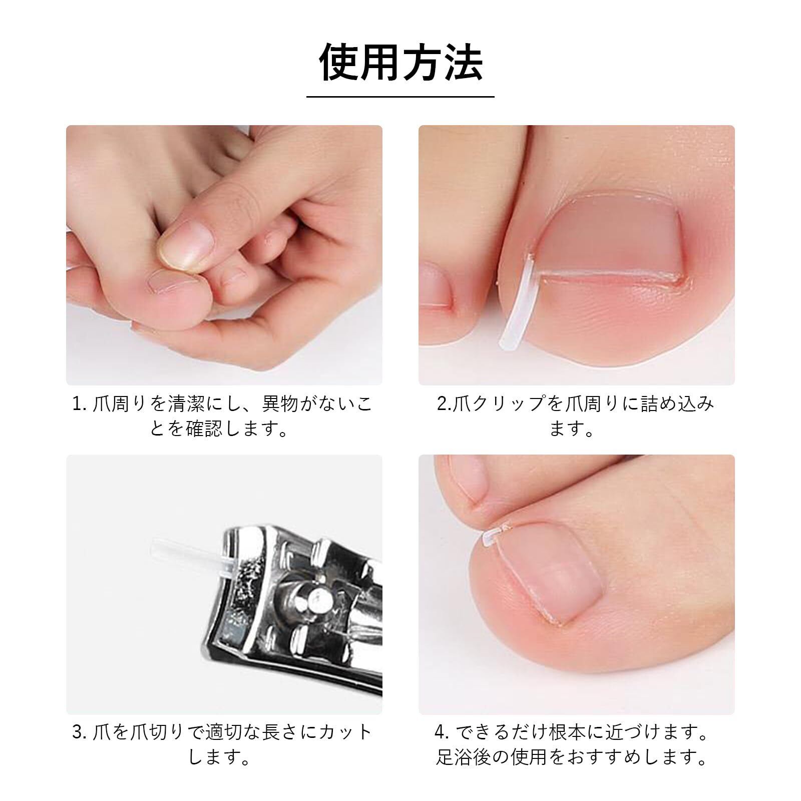 【使用方法】クリップを爪に固定し、爪の両端を優しく持ち上げ、痛みのある爪を調整します。初心者でも簡単に装着でき、自分で手入れできます。