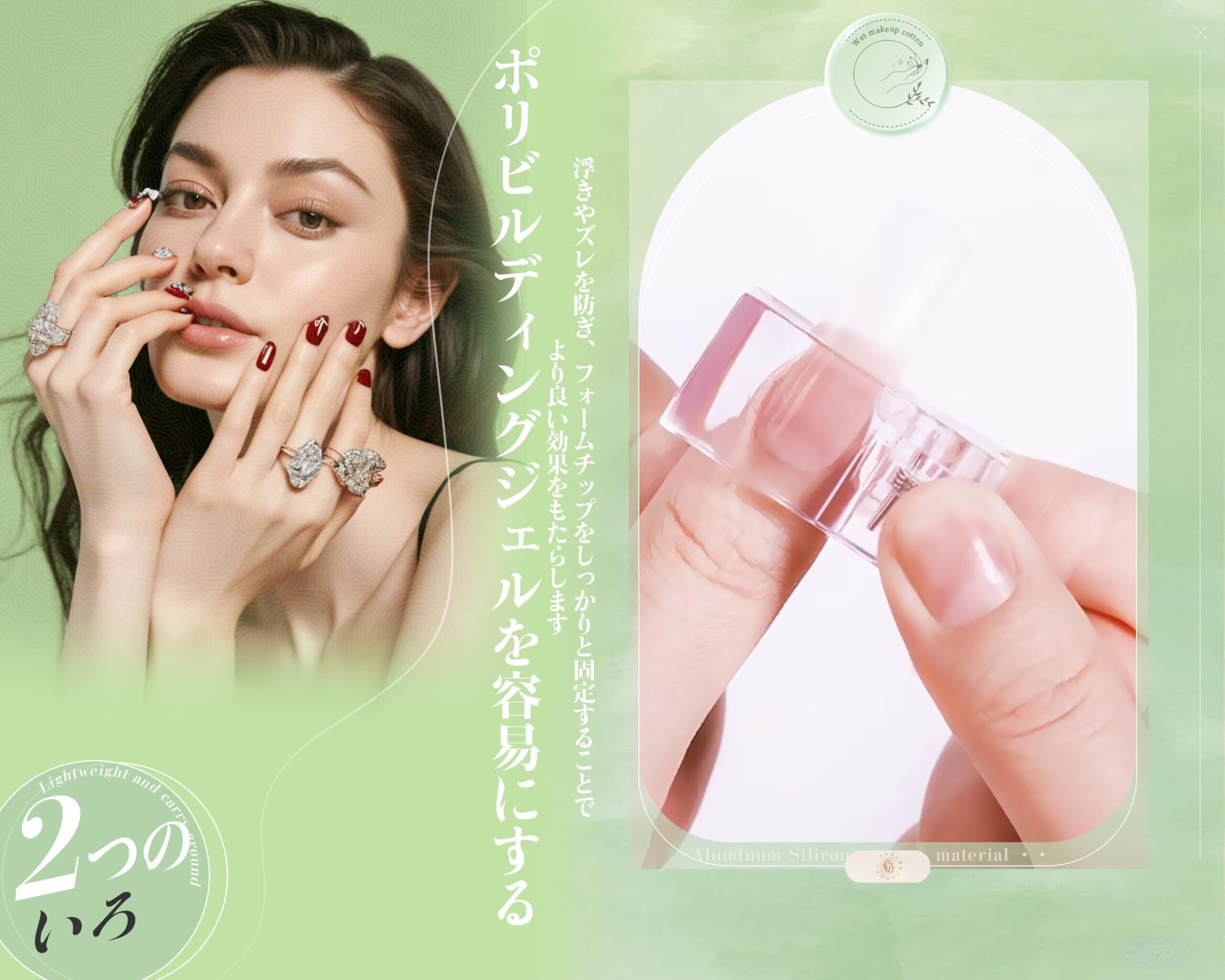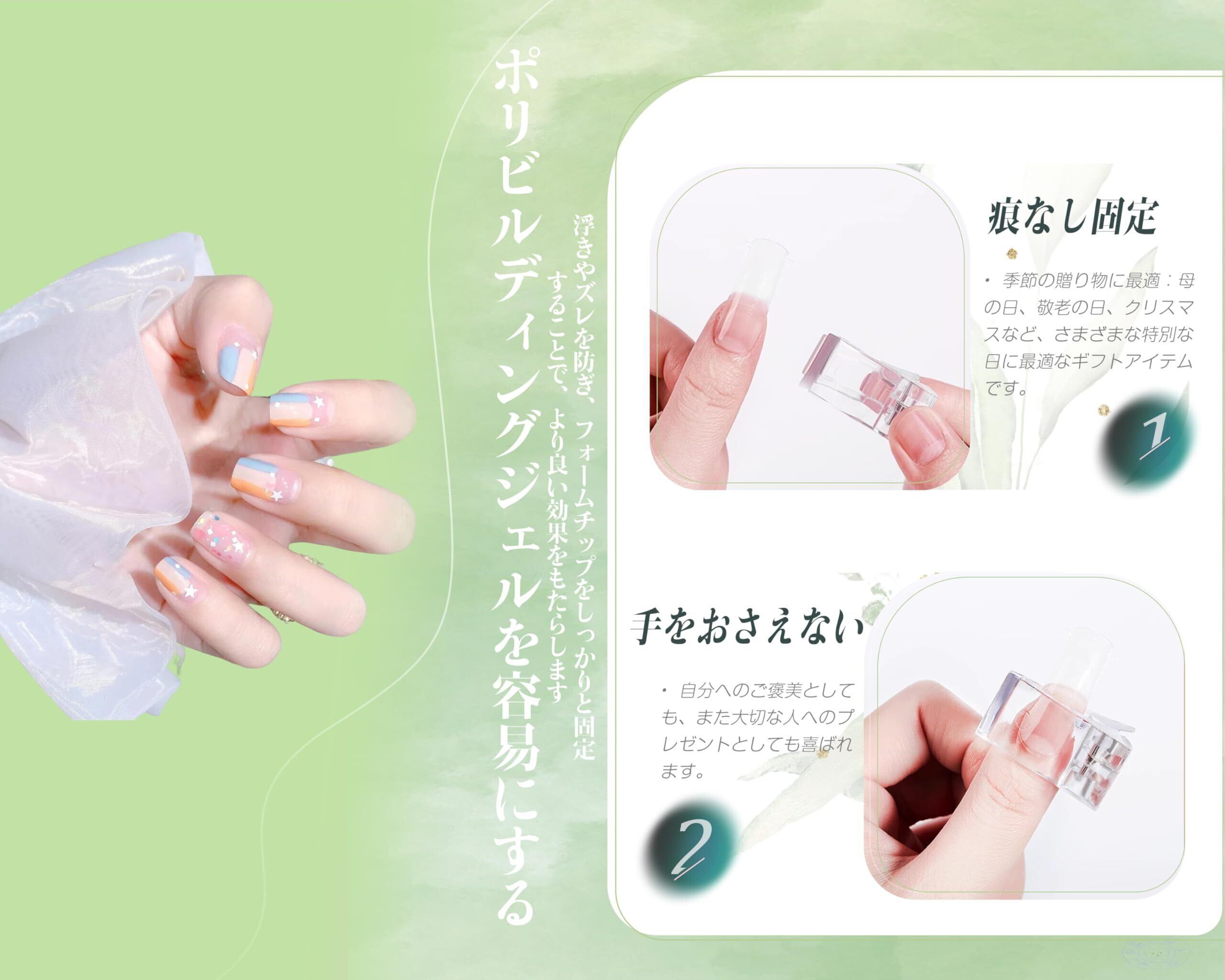 3. 使い方と便利性 使い方の簡便さ:まず下準備を行い、次にポリジェルを爪の上に出し、チップを装着します。最後に、指先よりも手前に被せて、指先と爪を同時にクランプします。クリアなデザインにより、UVやLEDライトでの硬化作業を妨げません。
