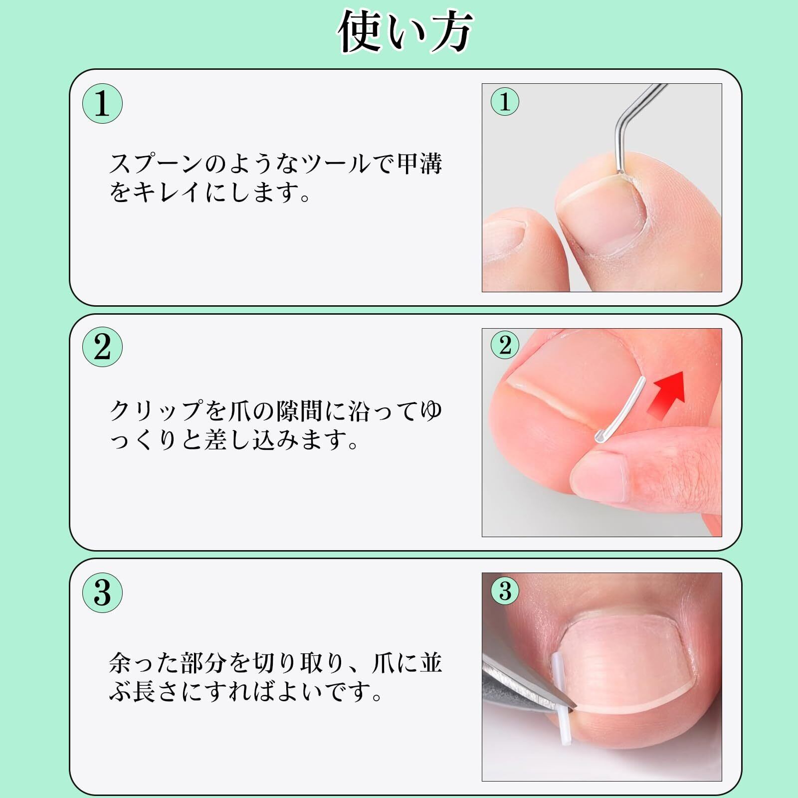 【使用方法】Step1:ネイルケアツールで爪の隙間をキレイにします。Step2:半透明のクリップを爪の隙間に沿って差し込みします。Step3:余った部分を爪の長さに合わせてカットします
