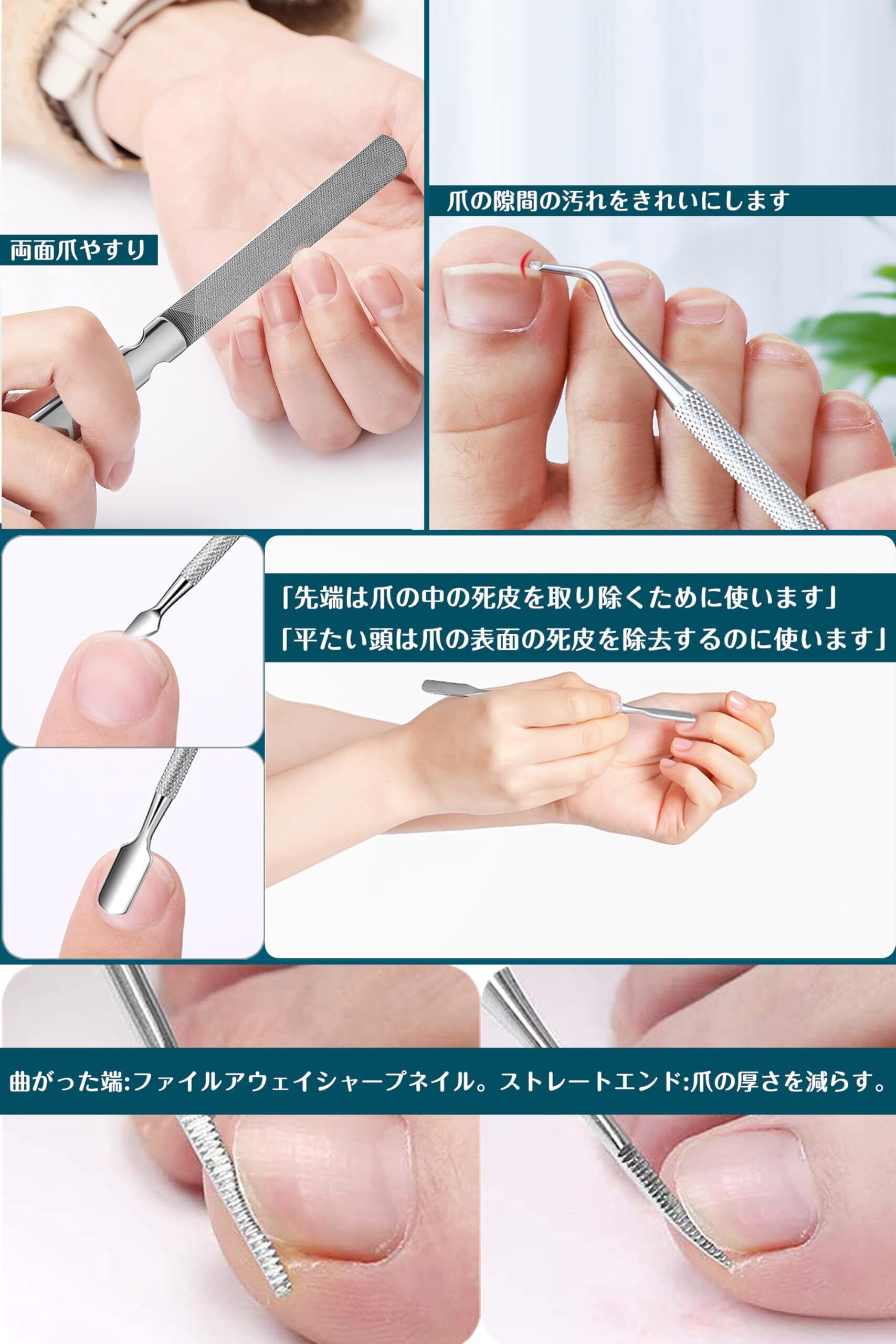 【ネイルケアの必需品&多機能·多種類】①ネイルクリッパーキットには、ハンドケア、フットケアのすべてのニーズを満たすためのさまざまなネイルツールが含まれています。②爪の種類に応じて、ニッパー式爪切りや爪切りを使ってトリミングすることができます、自分に満足できる効果を獲得出来ます。③硬い足爪、巻爪、変形爪のカットに最適なクラシックタイプ(ニッパー)の爪きりです。④小さい爪切り(2枚入り)、平頭爪切りは柔らかい爪を切るのに使用でき、先端が斜めになっている爪切りは、手の爪の切りにくい部分を切るのに使える。⑤さらに、サンディング、バフ研磨、爪のクリーニング用のその他のネイルツールが 5 つあります。