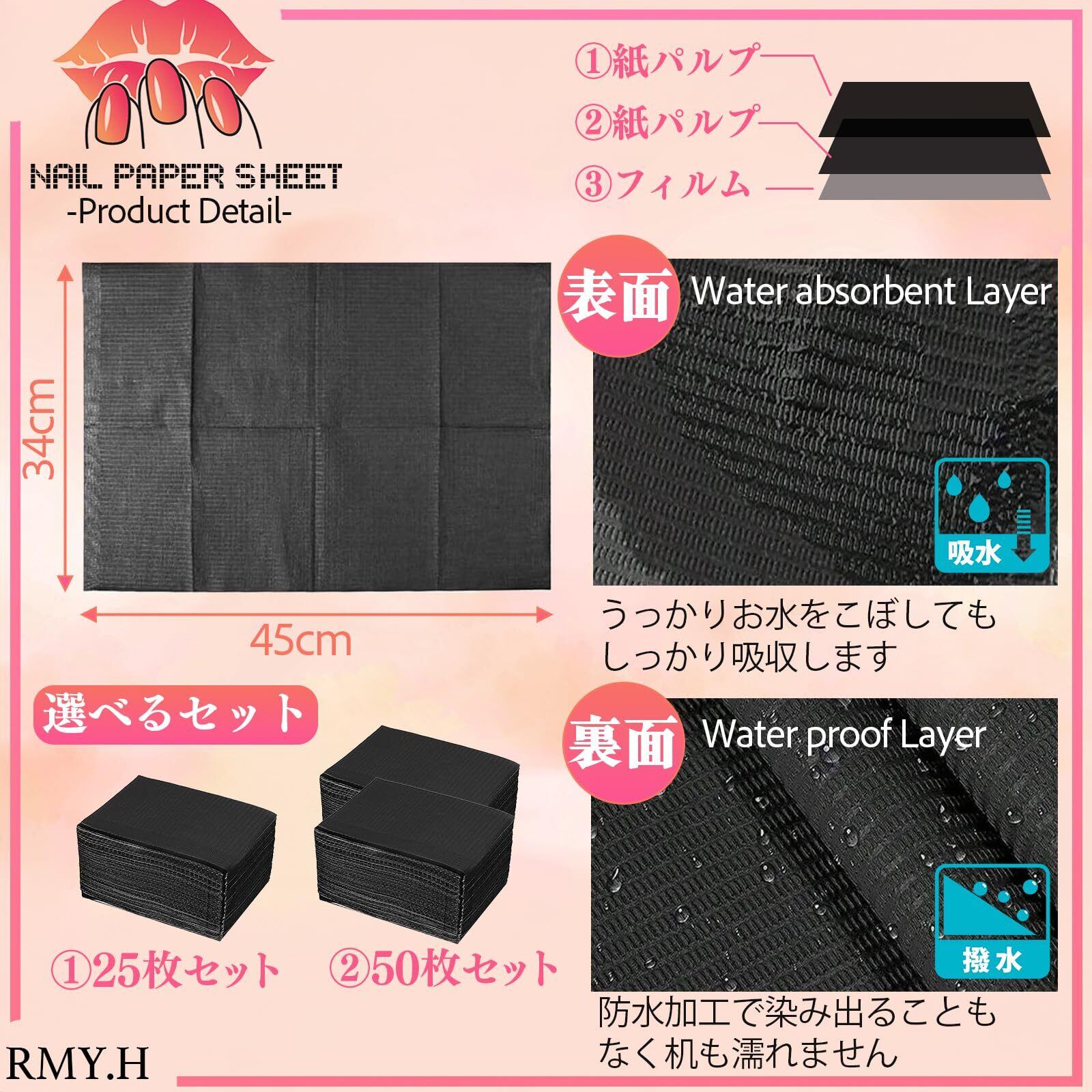 ネイル施術中の机汚れや水濡れ、削りカスの片付けに悩んでいませんか?RMY.Hのネイルペーパーシートは、防水仕様で液体やダストをしっかりガード。使い捨てタイプだから、サロンや自宅ネイル後の片付けがぐっと時短に。黒色で汚れが目立ちにくく、清潔感を保ちながら作業効率もアップ。ネイル検定や出張施術、イベントなど様々なシーンで活躍します。衛生的でスマートな施術環境を、この一枚から始めませんか? 【防水&衛生的】液体やダストから机を守る防水ネイルペーパーシート。施術後の清掃も簡単で、衛生管理にこだわる方に最適。