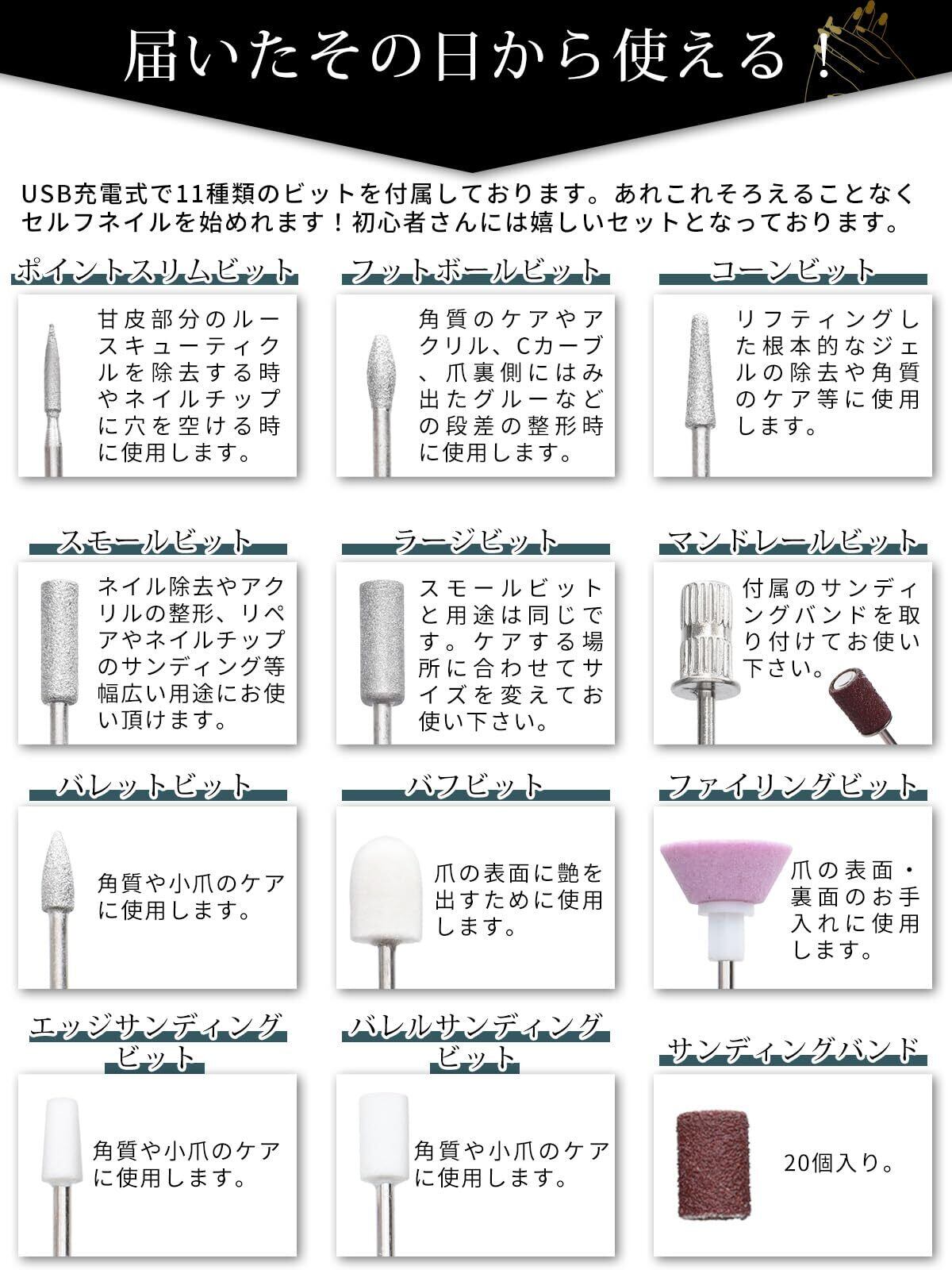 ネイルマシンは18000rpm回転となっており、初心者専用として設定開発しております。2段階のスピード調節機能でより安全に!USB充電式で11種類のビットを付属しております。