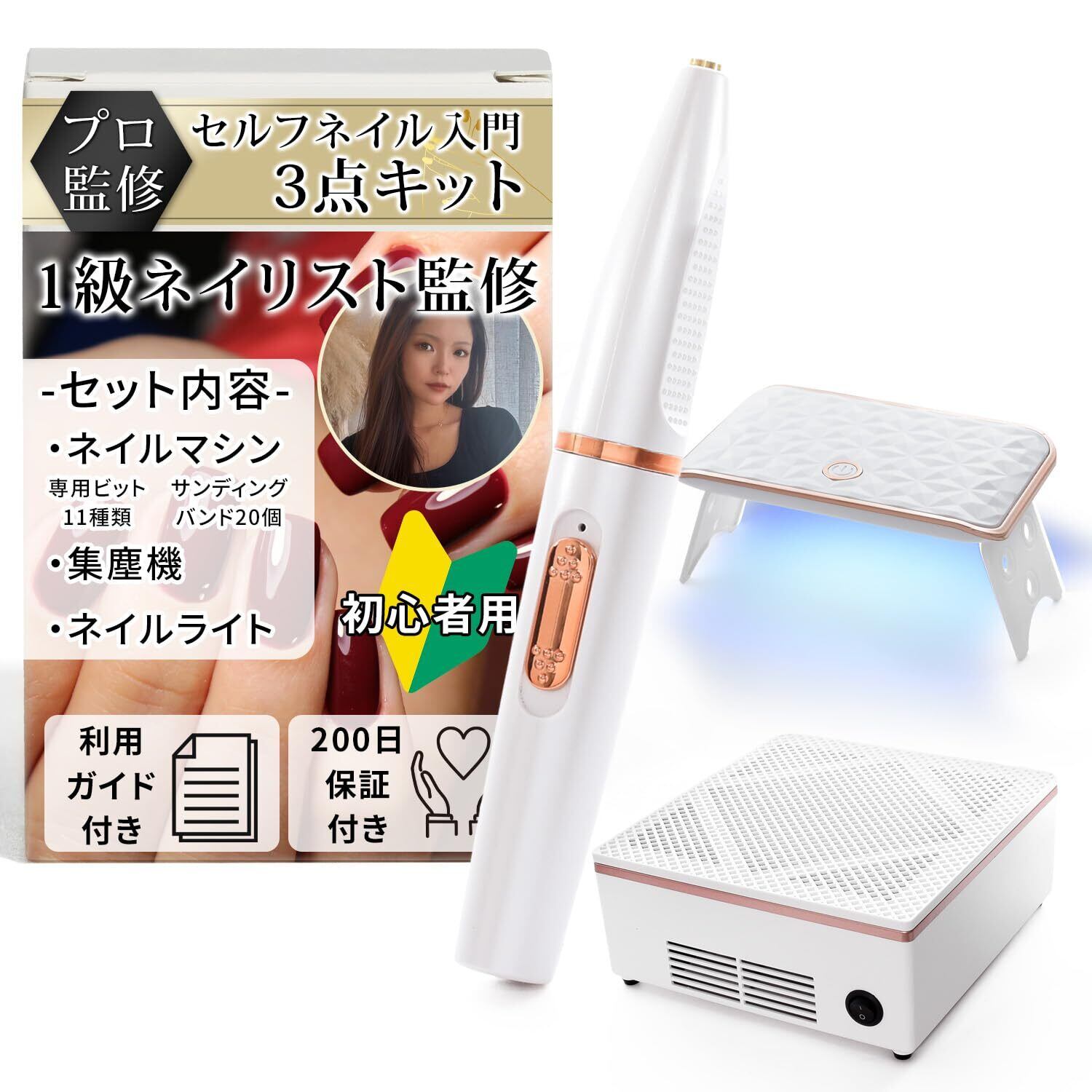 ネイルマシン コードレス 集塵機 ネイルライト 初心者用3点セット『届いたその日から始められる』 (ホワイト)